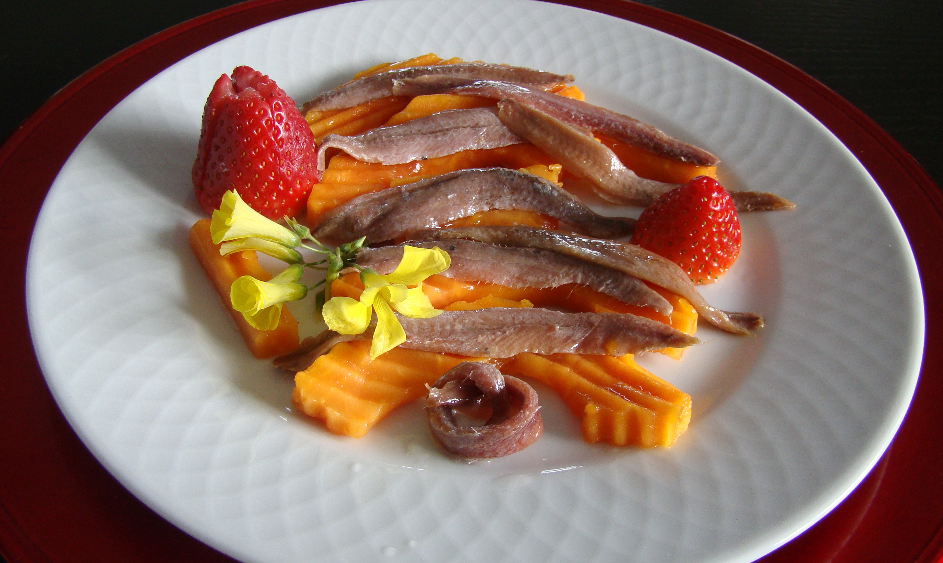 INGREDIENTES: 1 trozo de papaya, 1 lata de anchoas, fresas al gusto.