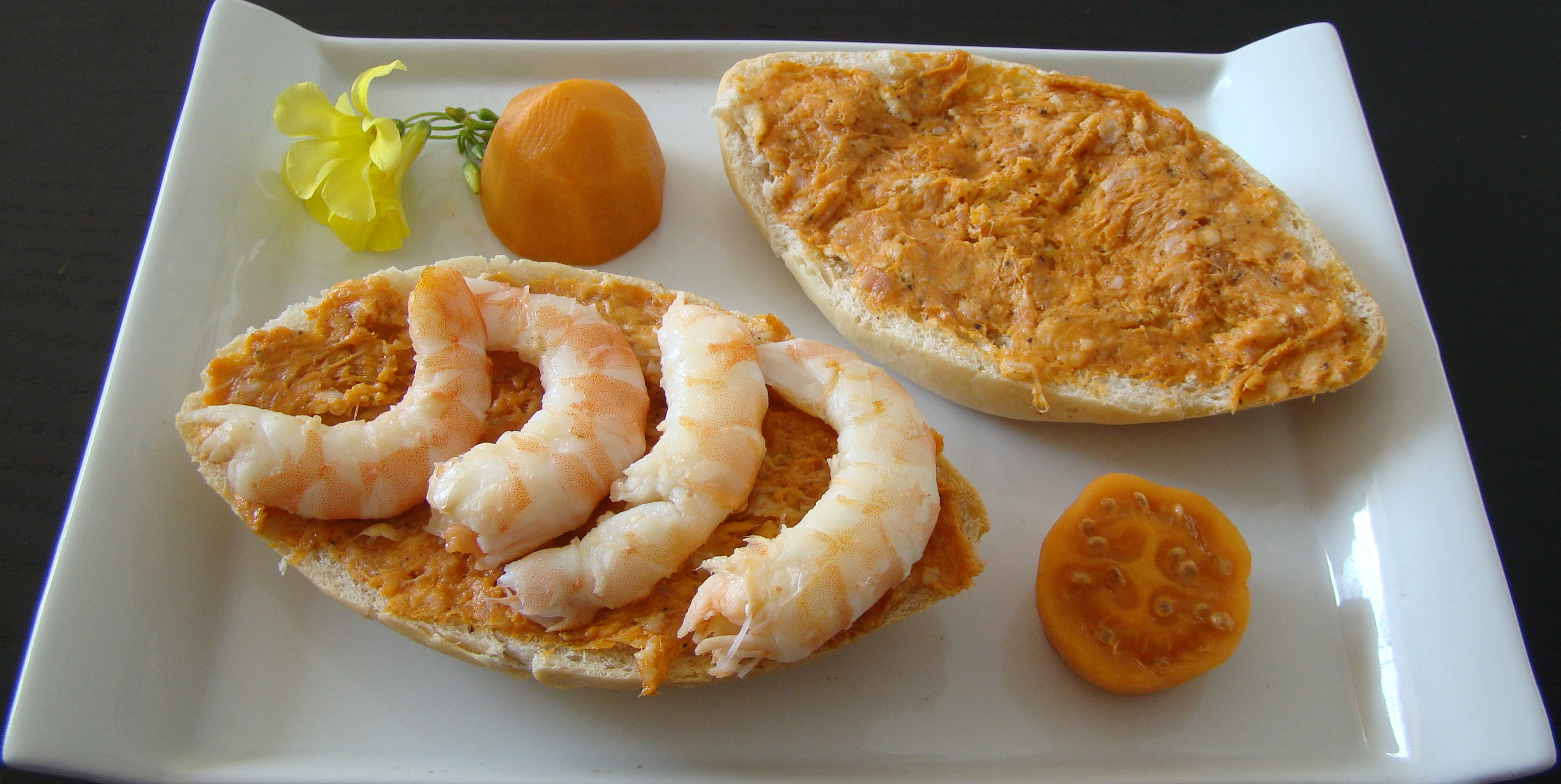 PREPARACIÓN: asamos las gambas y las pelamos, untamos el chorizo en el pan, añadimos las gambas y juntamos las partes del pan.