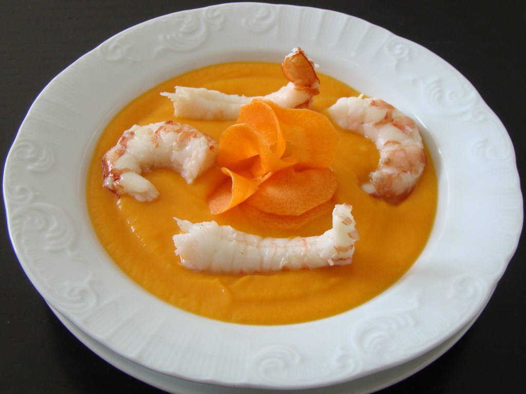 PREPARACIÓN: ponemos en el caldero, el aceite, los ajos y doramos. Agregamos las papas, las zanahorias, cubrimos de agua, ponemos sal al gusto y guisamos a fuego medio durante 30 minutos. Apartamos, trituramos y al momento de servir añadimos las gambas.