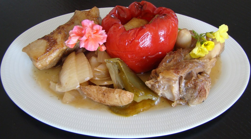 PREPARACIÓN: en un caldero freímos los trozos de cordero, sacamos y reservamos. En el mismo caldero freímos el pimiento rojo entero al que previamente hemos quitado las granas, sacamos y reservamos. Seguimos utilizando el mismo aceite para sofreír la cebolla, el pimiento verde limpio y troceado, el membrillo pelado y cortado en tiras. Agregamos el cordero, el vino, la sal y guisamos a fuego lento durante 75 minutos con el caldero tapado. En el emplatado utilizamos el pimiento rojo reservado. Las flores son opcionales y comestibles.