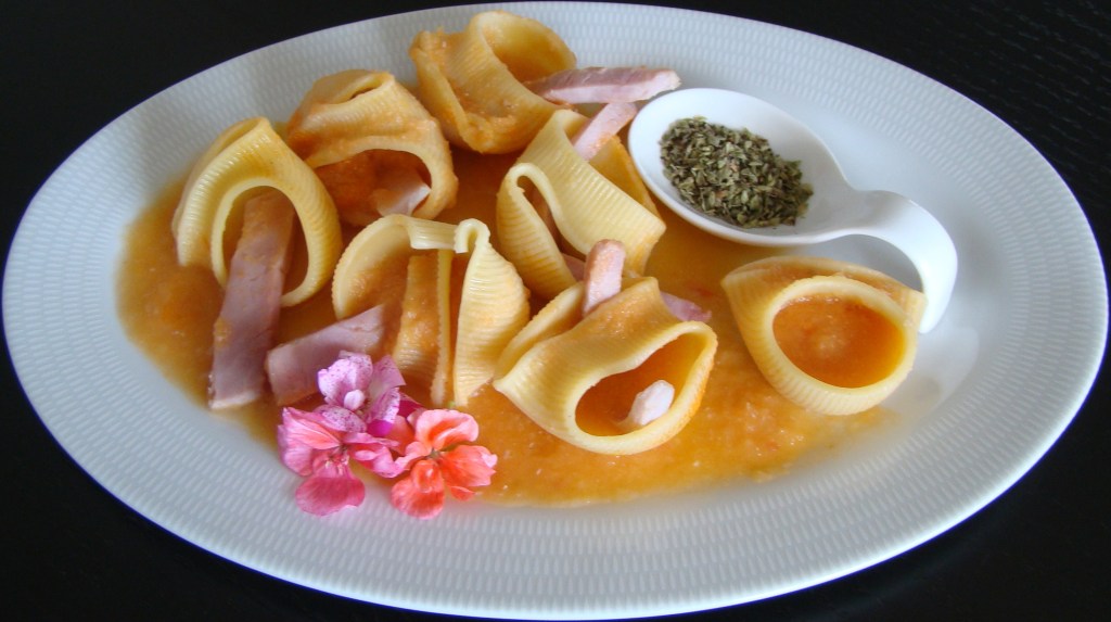 PREPARACIÓN: guisamos la pasta con un litro de agua, 9 minutos. Hacemos el sofrito, trituramos y reservamos. Cortamos el jamón en tiritas y reservamos. Escurrimos el agua de la pasta, añadimos la salsa, el jamón y en el momento de servir espolvoreamos el orégano. Las flores son de geranio.