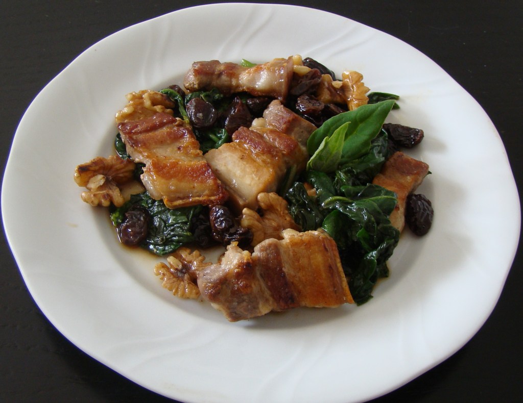 INGREDIENTES: 150 gramos de panceta fresca, 1 manojo de espinacas, 2 cucharadas de nueces, 2 cucharadas de pasas, 1 cucharadita de aceite de oliva virgen, 2 cucharadas de Brandy, sal al gusto.