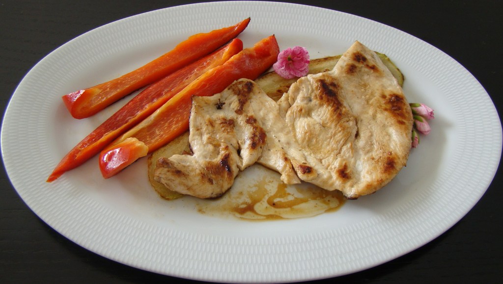 INGREDIENTES: 1 pechuga con corte muy fino, 1 pimiento rojo, 1 calabacín, 1 cucharadita de aceite de oliva virgen y sal al gusto.