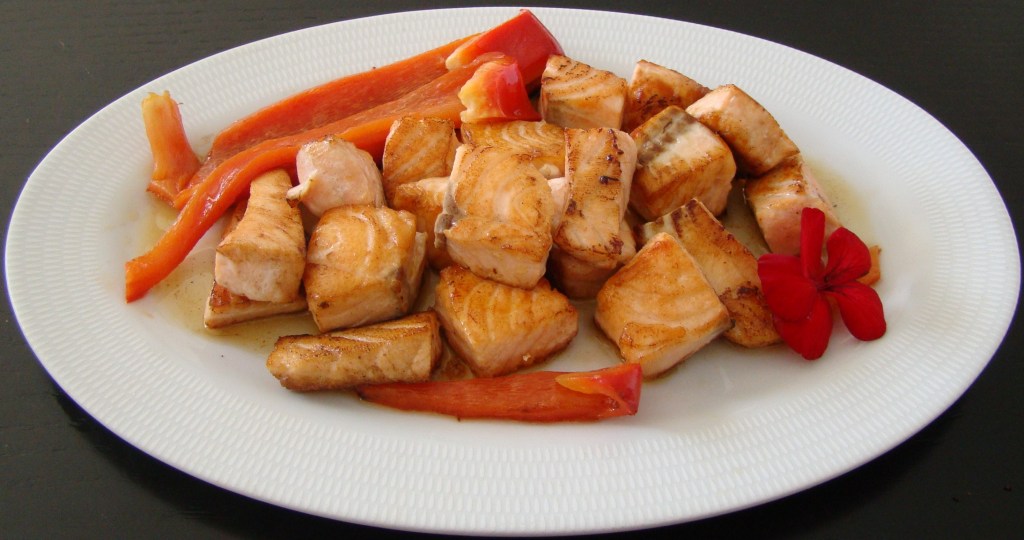 PREPARACION: si es congelado sacamos unas horas antes del congelador, cortamos en trocitos y reservamos. En una sartén ponemos el aceite y asamos el pimiento, reservamos y con el mismo aceite asamos el salmón durante 2 minutos, damos la vuelta y después de un minuto más, apartamos y servimos.