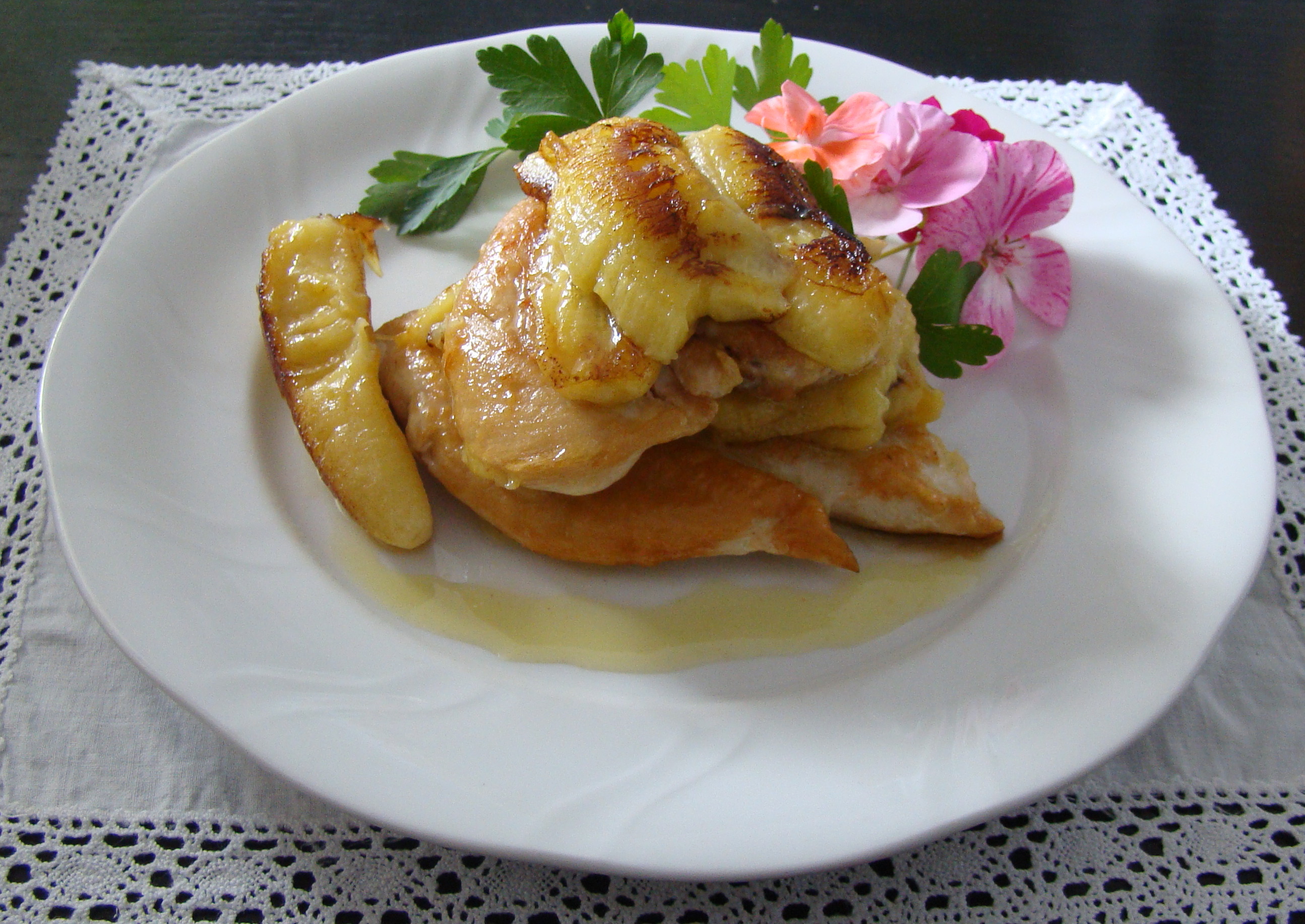 PREPARACIÓN: ponemos en una sartén el aceite y cuando esté caliente agregamos la pechuga, los plátanos y asamos. Emplatamos con flor de geranios y perejil. (ambos son comestibles)