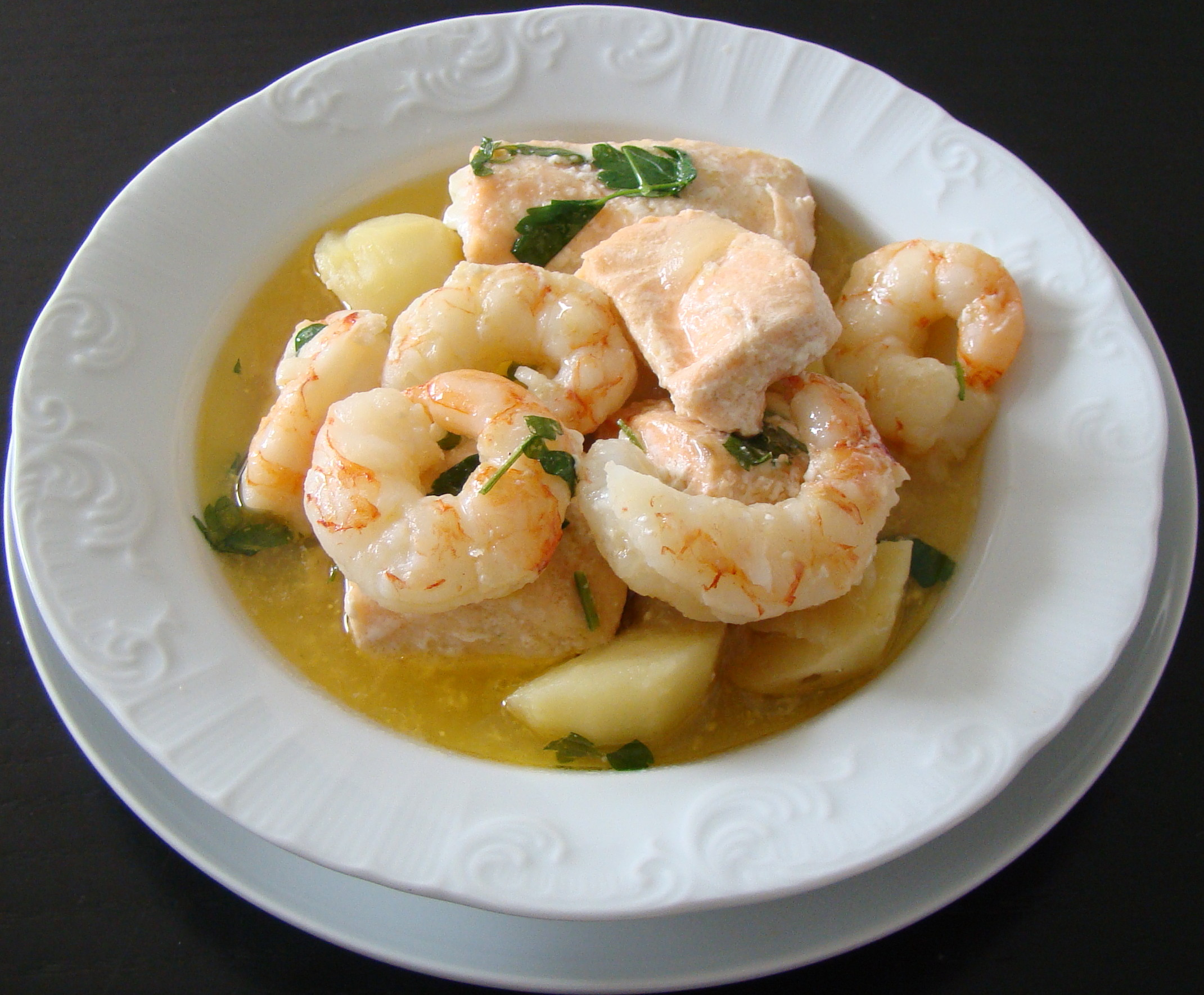 PREPARACIÓN: en un caldero adecuado ponemos el aceite y cuando esté caliente añadimos las papas troceadas, la cebolla en trozos y los ajos enteros; removemos, dejamos unos minutos de cocción, agregamos 3 vasos de agua y, cuando las papas estén guisadas, añadimos el salmón cortado en trozos y las gambones. 2 minutos más de cocción y apartamos. Le añadimos el perejil picadito, dejamos reposar 8 minutos y servimos.