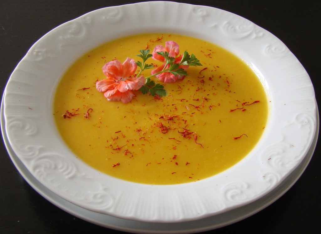 PREPARACIÓN: en un caldero pequeño ponemos el aceite y doramos los ajos, agregamos el resto de verduras cortadas en trozos y guisamos durante 20 minutos. Apartamos y trituramos. Al momento de servir le ponemos el azafrán y las flores de geranio (son comestibles)