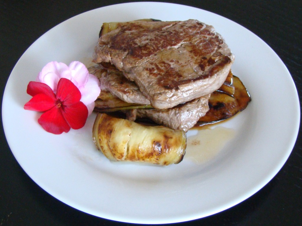 PREPARACIÓN: ponemos el aceite en una sartén y asamos la berenjena. En otra sartén ponemos el aceite y vamos asando los solomillos así sale todo a la misma vez y se sirve caliente.