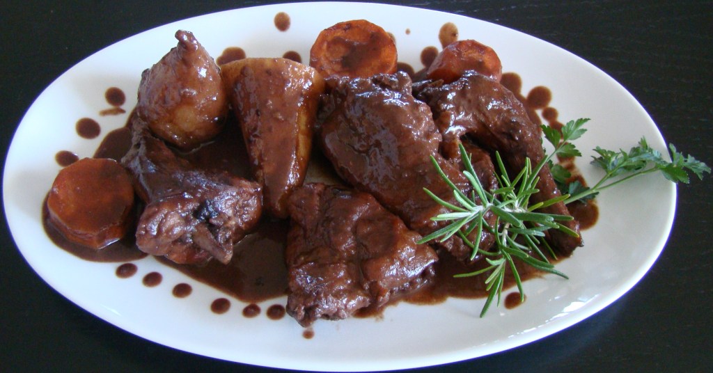 PREPARACIÓN: pasamos el conejo por la harina, ponemos en un caldero plano alto el aceite y cuando esté caliente, lo freímos, añadimos las zanahorias cortadas, el Brandy, (Subimos el fuego para quemar el alcohol) añadimos el vino, las peras enteras peladas, la sal y guisamos durante 40 minutos a fuego suave, 5 minutos antes de apartar añadimos el chocolate rallado.
