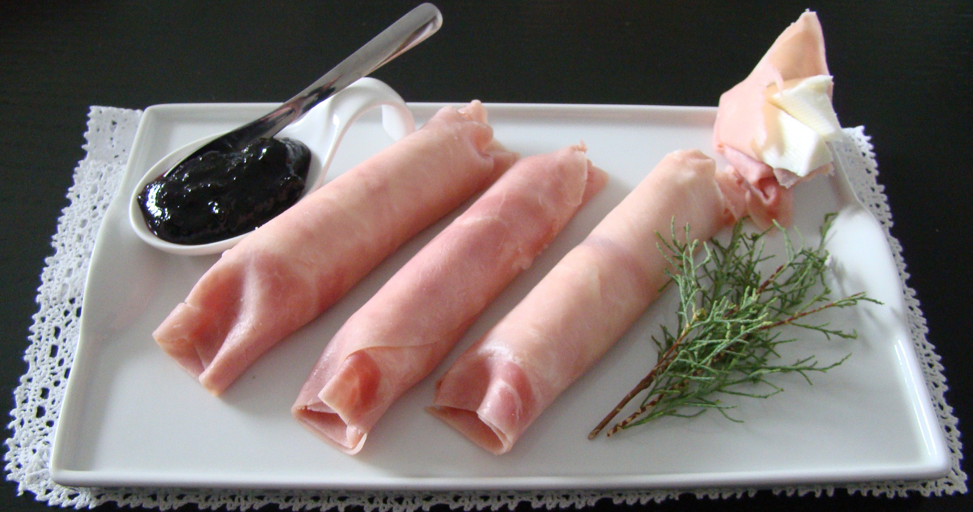 PREPARACIÓN: cortamos el queso en lonchas finas y ponemos encima del jamón, enrollamos y acompañamos con la mermelada.