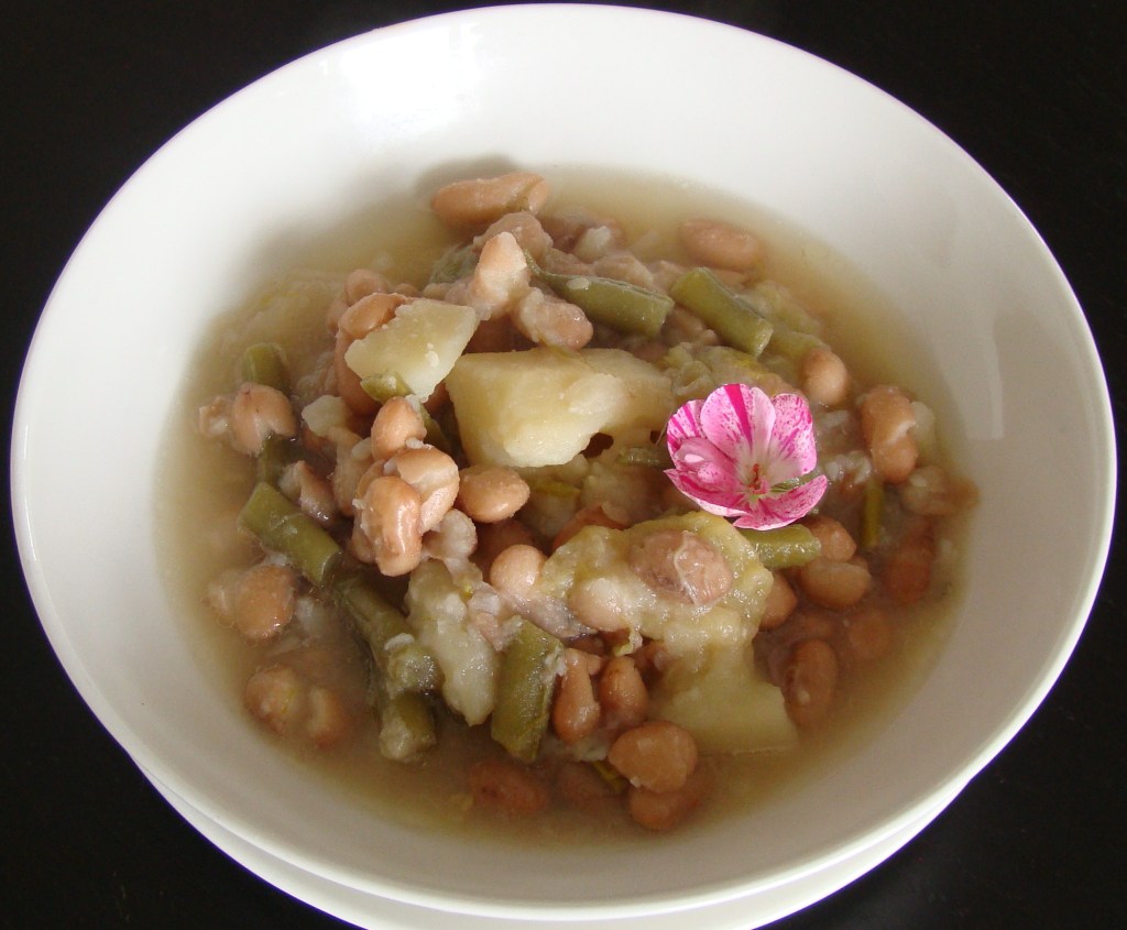 INGREDIENTES: 1 vaso de judías pardas, (ponemos en remojo toda la noche) 1 cebolla, 2 dientes de ajo, 2 cucharadas de aceite de oliva virgen, 1 trozo de bubango, 100 gramos de habichuelas tiernas, 3 papas grandes y sal al gusto.