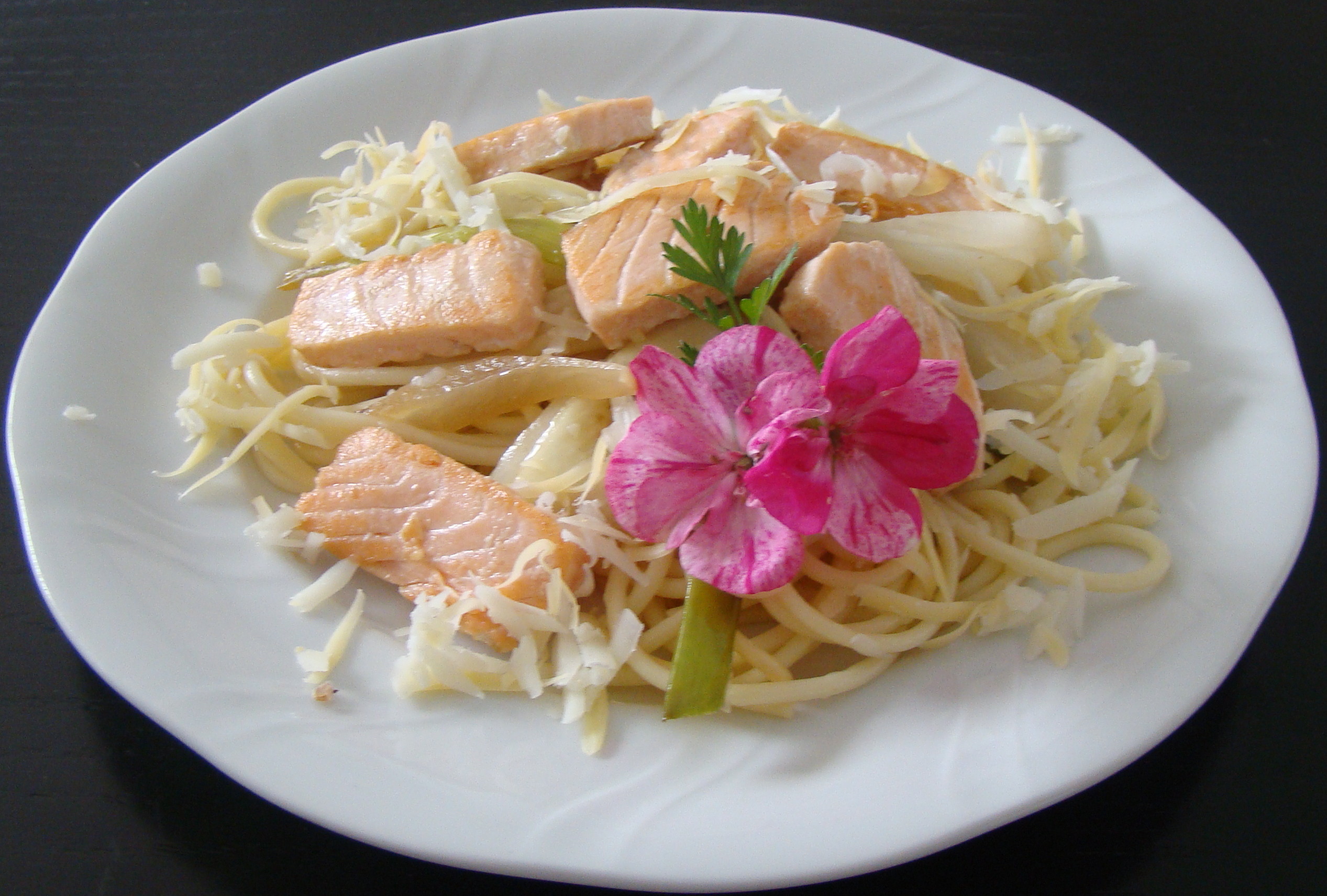 INGREDIENTES: 150 gramos de espaguetis, 300 gramos de salmón, 1 cebolla, 1/2 puerro, 100 gramos de queso curado, 2 cucharadas de aceite de oliva virgen y sal al gusto.