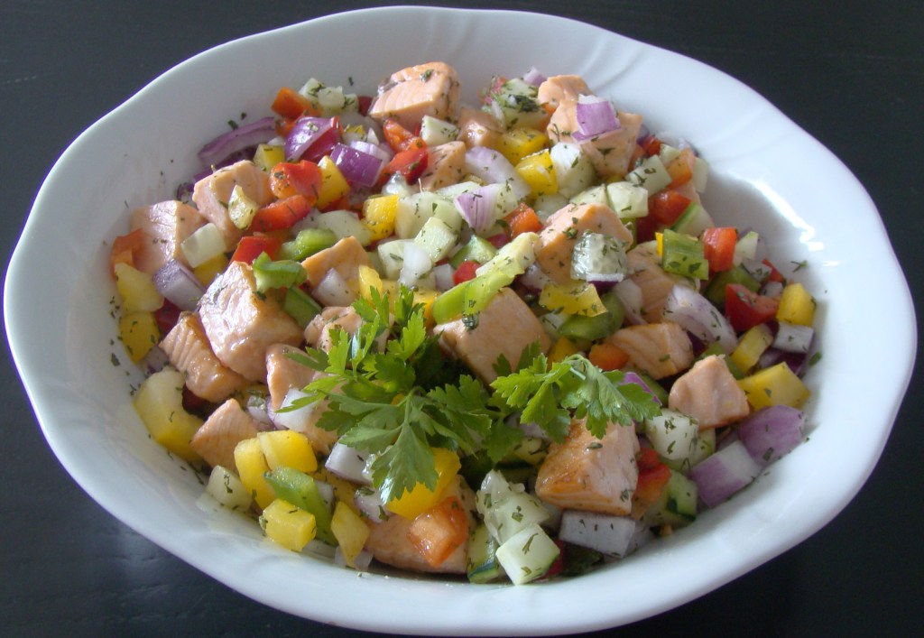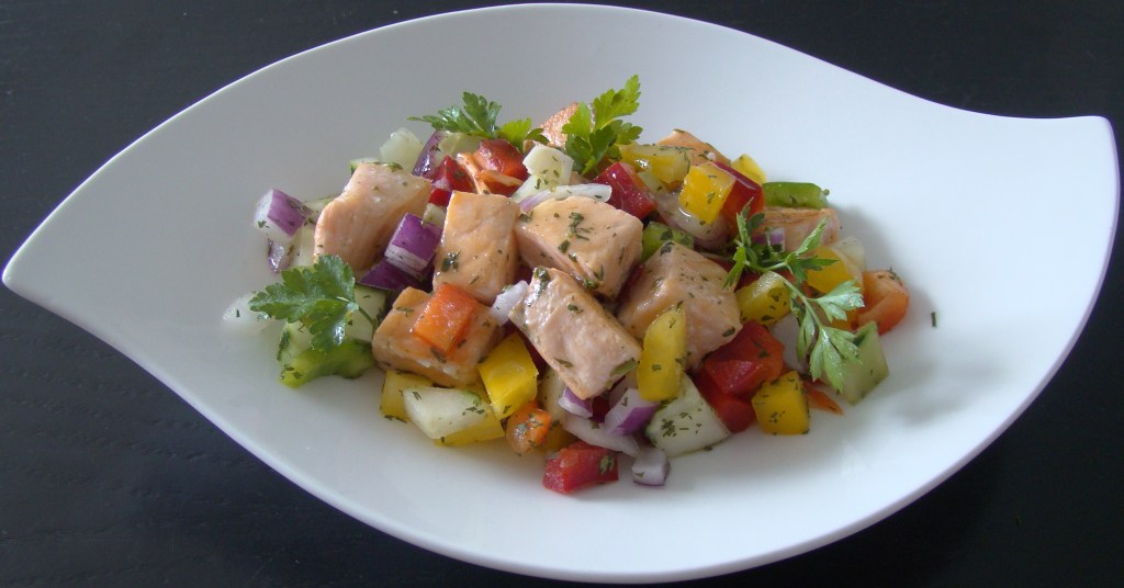 INGREDIENTES: 2 filetes de salmón, 1/2 cebolla roja, 1/2 pimiento verde, 1/2 pimiento rojo, 1/2 pimiento amarillo, 1/2 trozo de pepino, 1 cucharada de perejil picadito, vinagre de vino y aceite de oliva virgen.