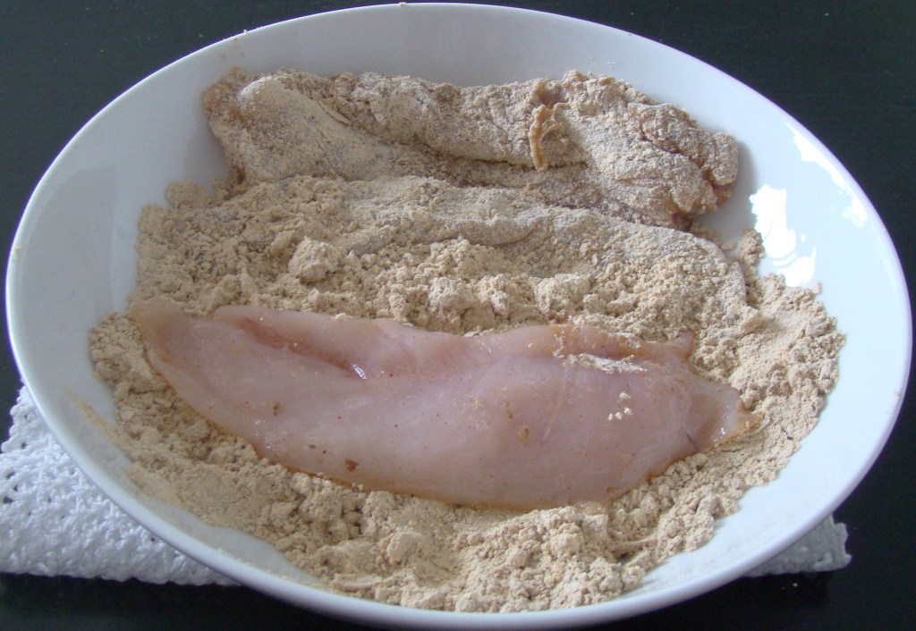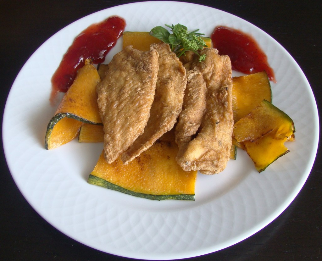 INGREDIENTES: 2 pechugas de pollo fileteadas, 4 cucharadas de gofio de millo sin gluten, la clara de 1 huevo, 1/2 cucharadita de pimentón de la Vera, 1/2 cucharadita de pimienta negra molida, 1 cucharadita de orégano, 1 cucharadita de sal, 2 cucharadas de mermelada de fresa, aceite de oliva para freírlas y un trozo de calabaza.