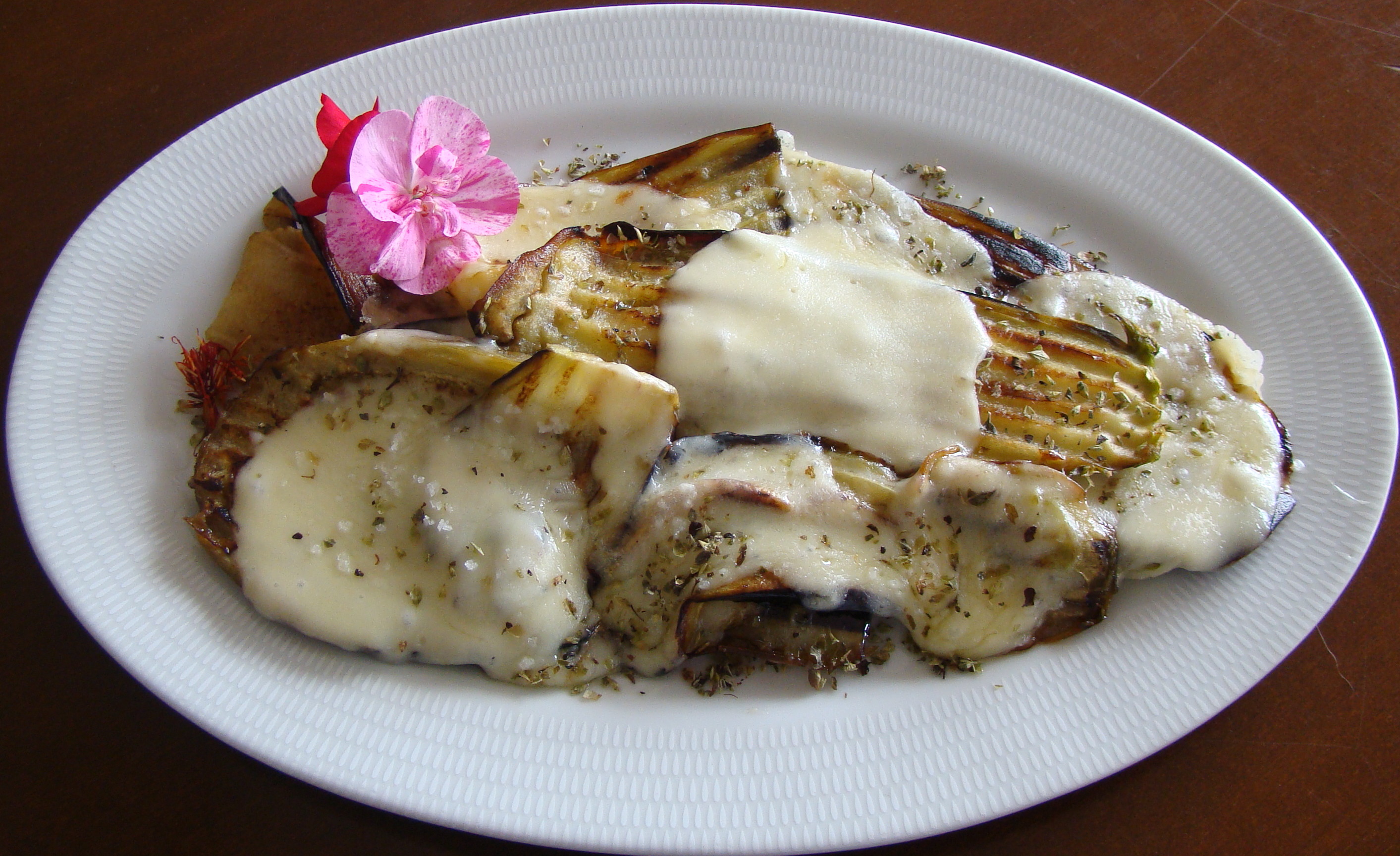 INGREDIENTES: 1 berenjena, 8 lonchas de mozzarella,1 cucharadita de orégano, 1/2 cucharadita de pimienta negra molida, 1 cucharada de aceite de oliva virgen,.