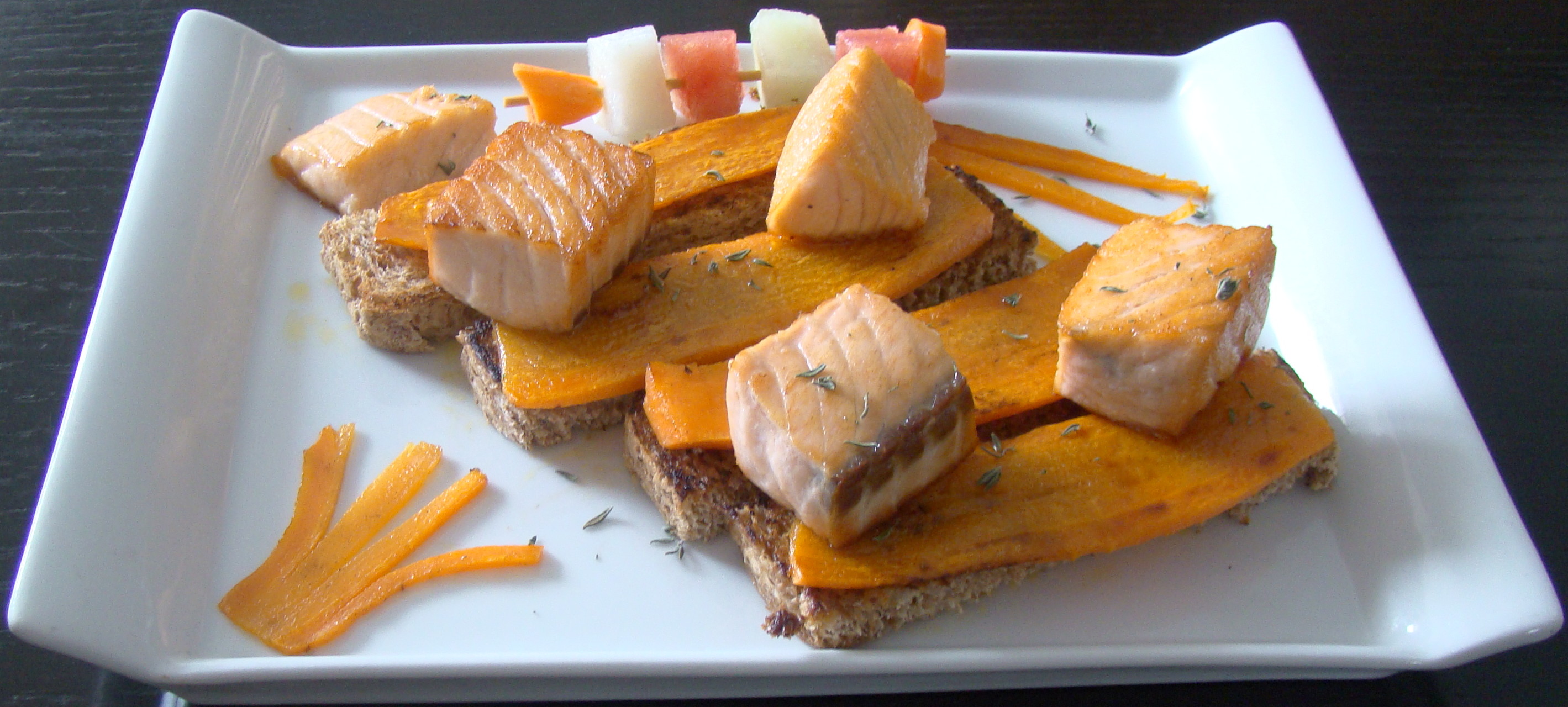 PREPARACIÓN: pelamos y cortamos la fruta en dados, la zanahoria en lonchas y el salmón en tacos. Asamos el salmón y la zanahoria y montamos unos montaditos con el pan. Con la fruta, hacemos una brocheta. Este plato está pensado para 1 persona; podemos adecuar los ingredientes al número de comensales.