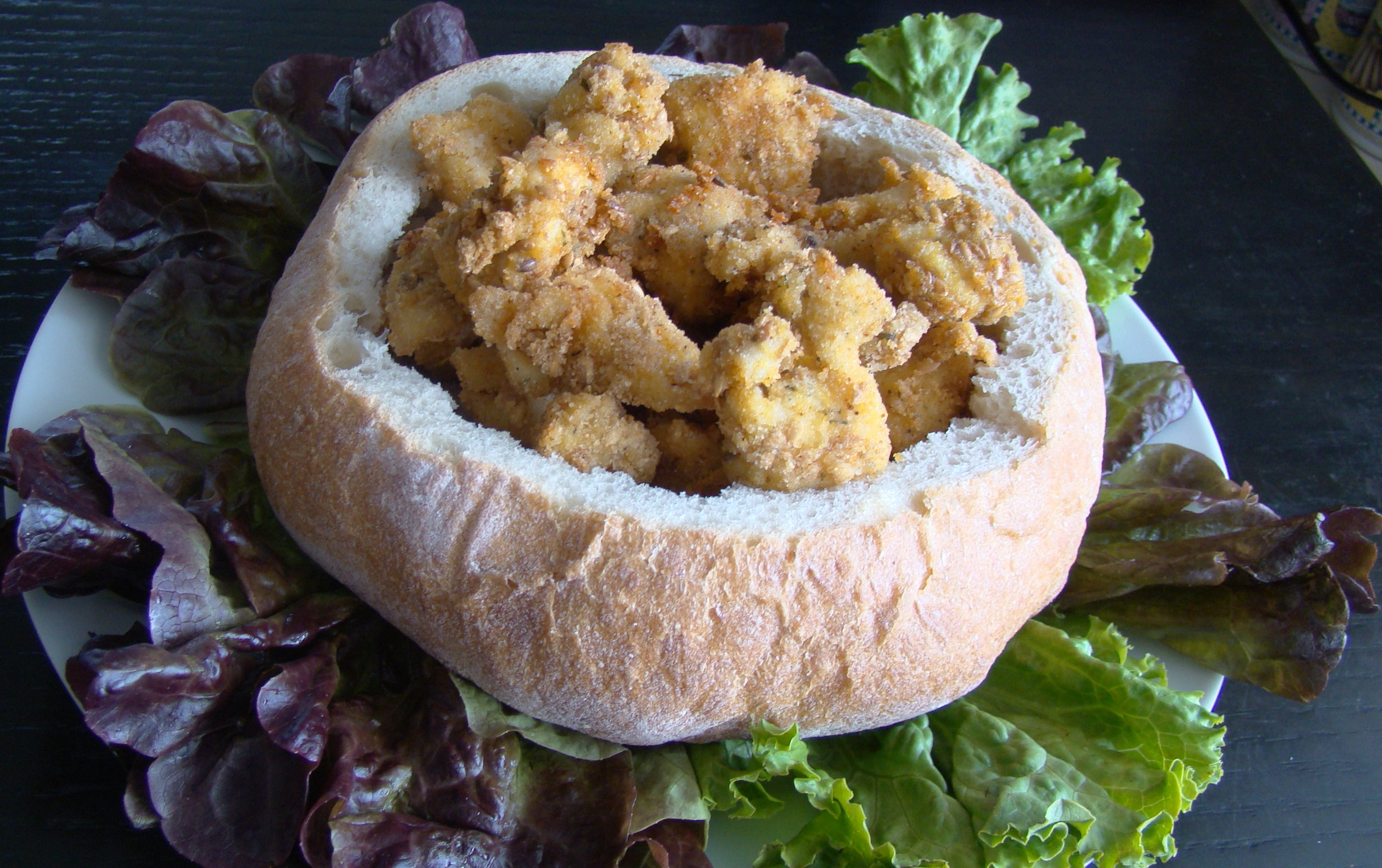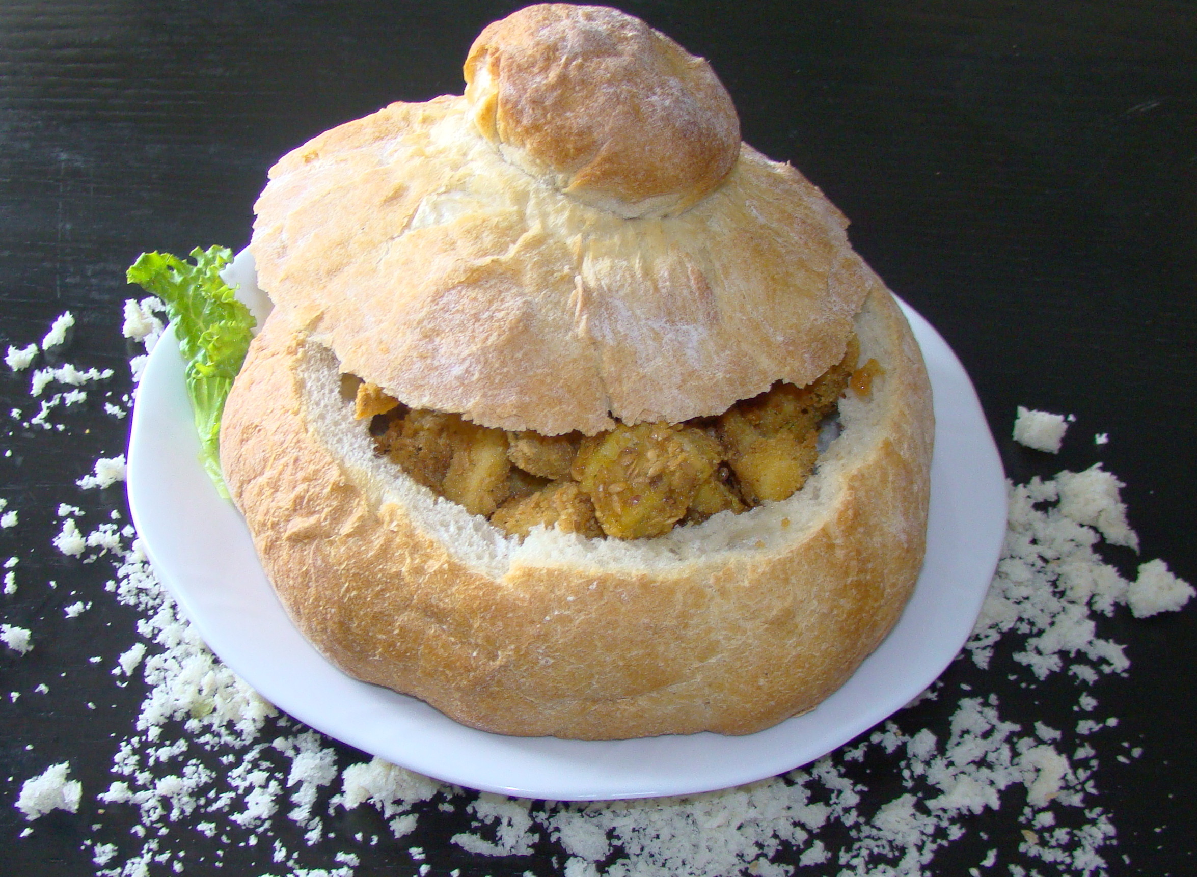 PREPARACIÓN: quitamos la miga al pan y lo dejamos listo para servir. Cortamos la pechuga en trocitos y reservamos. En un bol batimos la clara y añadimos la sal, la cúrcuma, el curry, el sésamo, la pechuga y dejamos en maceración durante 30 minutos. El pan rallado mezclado con el perejil lo añadimos al bol y mezclamos. En un caldero alto (para evitar las salpicaduras) ponemos el aceite y una vez caliente comenzamos a freír en pequeñas cantidades. Servimos utilizando el pan de moña. Hemos utilizado salsa de soja para acompañar a la carne.