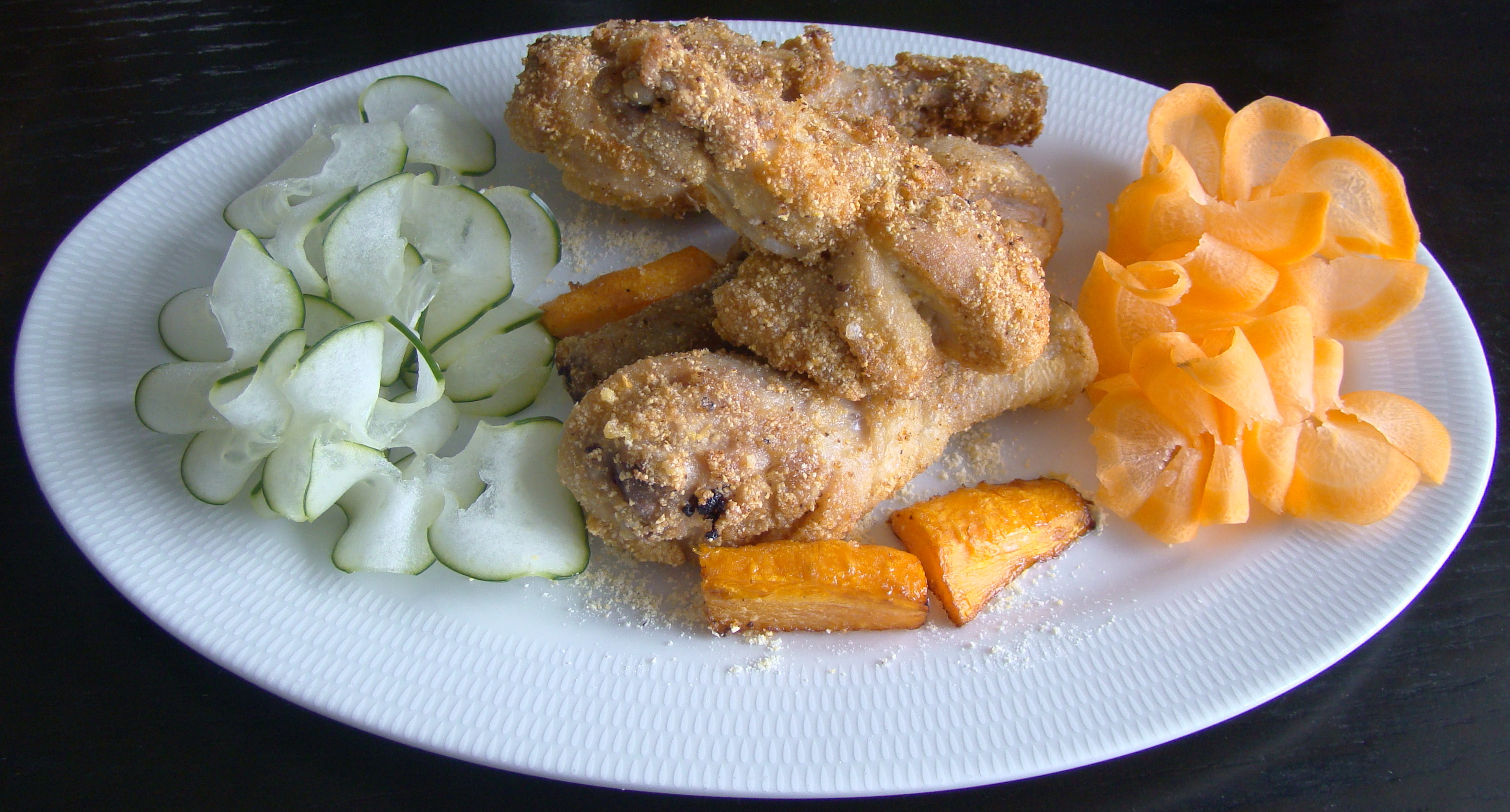 PREPARACIÓN: mezclamos la harina y la sal, pasamos los muslitos por la harina y freímos. Cortamos el pepino y la zanahoria y servimos.