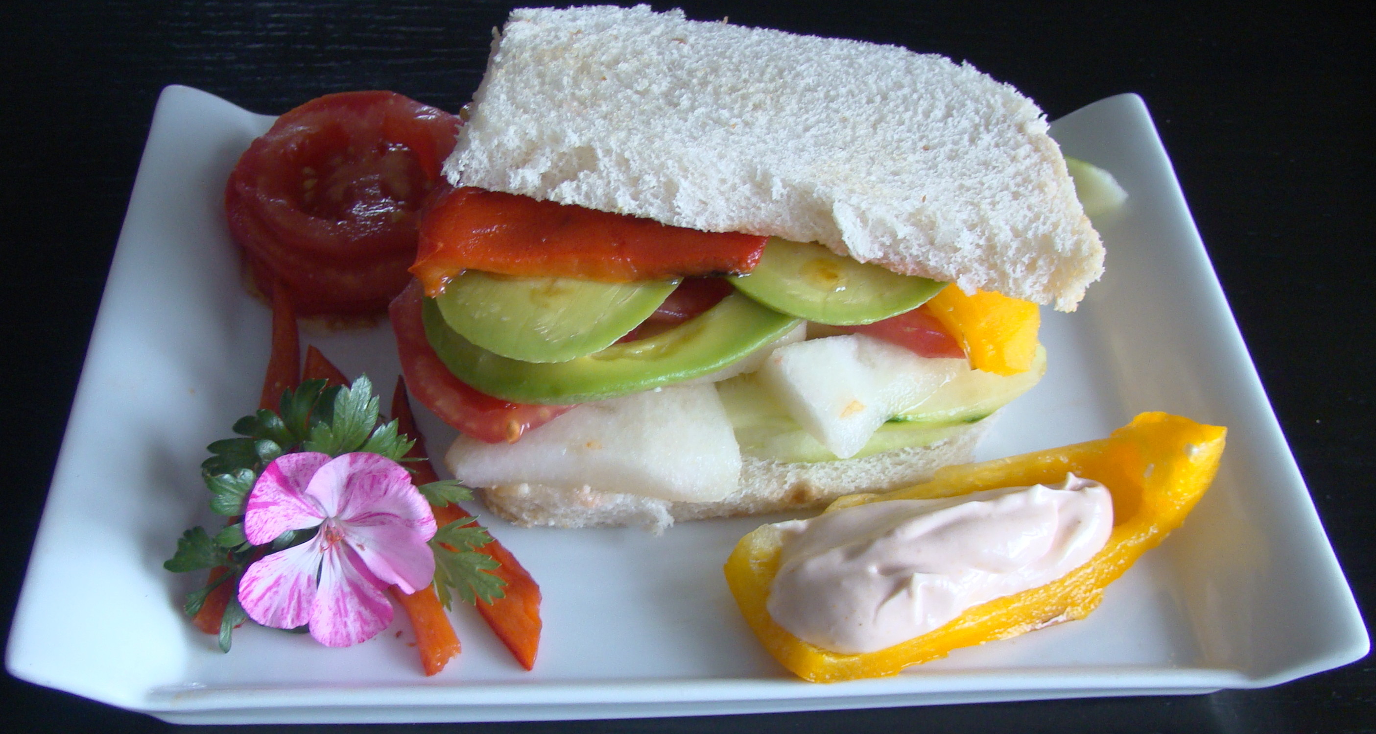 INGREDIENTES: pan de molde, 1 pera, 1/2 pimiento rojo, 1/2 pimiento amarillo,1 cucharadita de aceite de oliva virgen,1 tomate, 1 aguacate, 2 cucharadas de mayonesa, 1 trozo de pepino, 1/2 cucharadita de tomate kétchup y 1/2 cucharadita de Brandy.