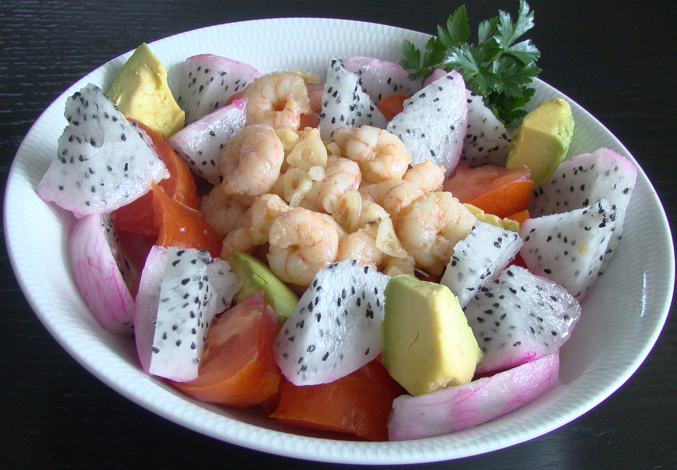 PREPARACIÓN: ponemos en una sartén el aceite de oliva virgen y doramos las gambas. Mientras se enfrían, en un bol, troceamos el tomate, el aguacate, la manzana, la pitaya y finalmente añadimos las gambas con su aceite y el zumo de limón.