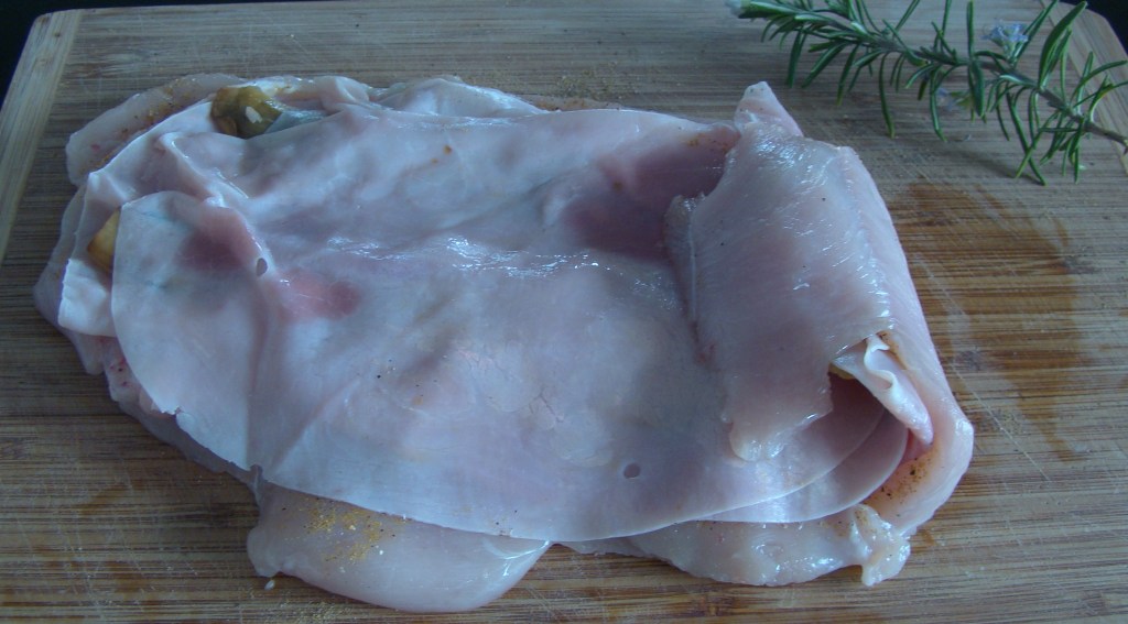 INGREDIENTES: 1 pechuga abierta, 1oo gramos de jamón york, 1 berenjena, 3 dientes de ajo. 1/2 cucharadita de sal y aceite de oliva para freír.