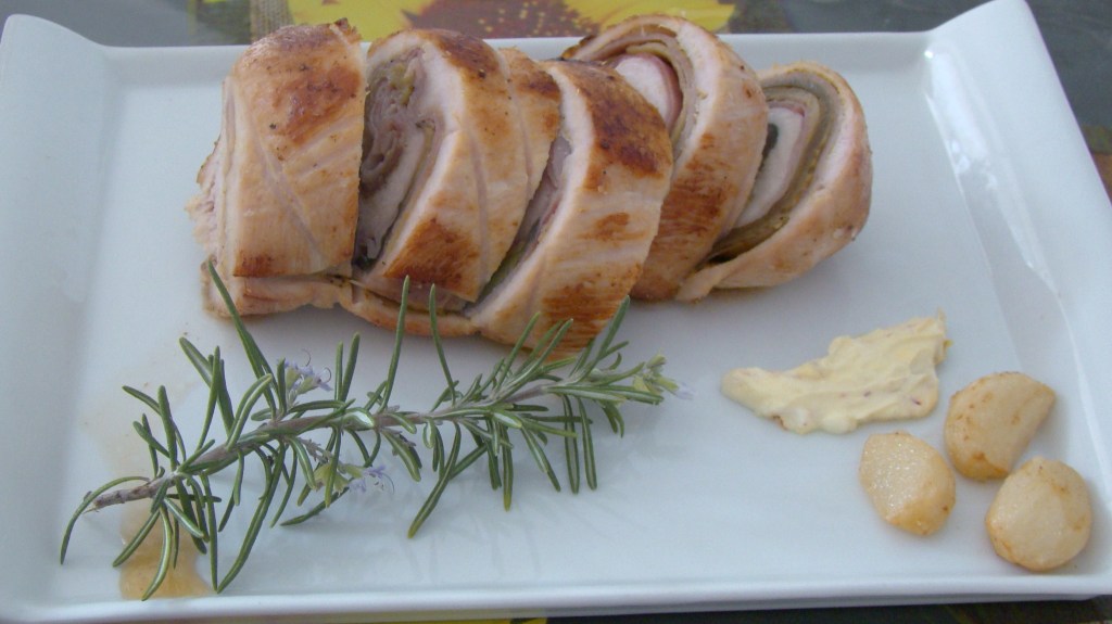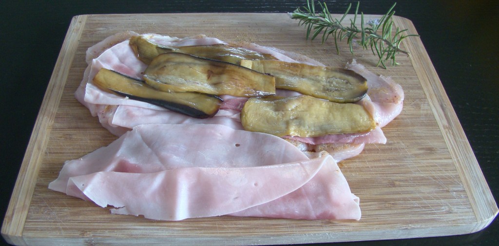 PREPARACIÓN: pelamos y asamos la berenjena con un chorrito de aceite (a veces tenemos que ir añadiendo más aceite) y reservamos. En una tabla de madera, ponemos la pechuga abierta y vamos colocando una capa de jamón y otra de berenjena, y así hasta terminar con los ingredientes. La enrollamos, la atamos con hilo de cocina, salpimentamos y freímos cubriendo de aceite.