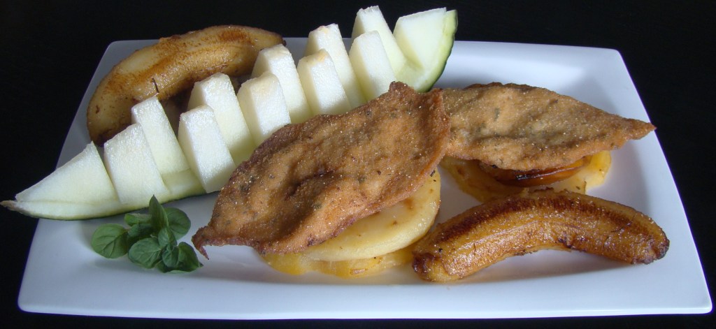 PREPARACIÓN: pelamos, freímos las manzanas y reservamos. En el mismo aceite, freímos las pechugas (las pasamos previamente por la harina de millo). Esparcimos por encima la mezcla de orégano y tomillo con la sal. Mientras, freímos los plátanos, cortamos el melón y servimos con las manzanas.