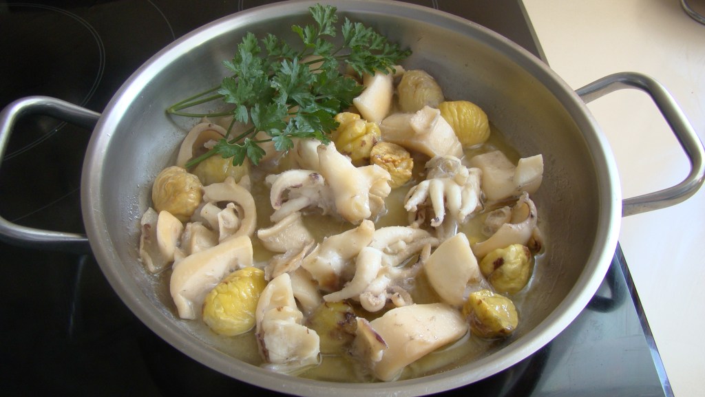 PREPARACIÓN: hemos comprado las sepias congeladas. Dejamos la noche anterior en la nevera, lavamos y cortamos en trocitos, secamos con un paño adecuado y en un caldero plano, ponemos el aceite y, cuando esté caliente, añadimos las sepias unos minutos y le añadimos el Brandy, la sal y las castañas peladas; mezclamos y guisamos durante 20 minutos a fuego medio comprobando antes de apartar, que la cocción está correcta.