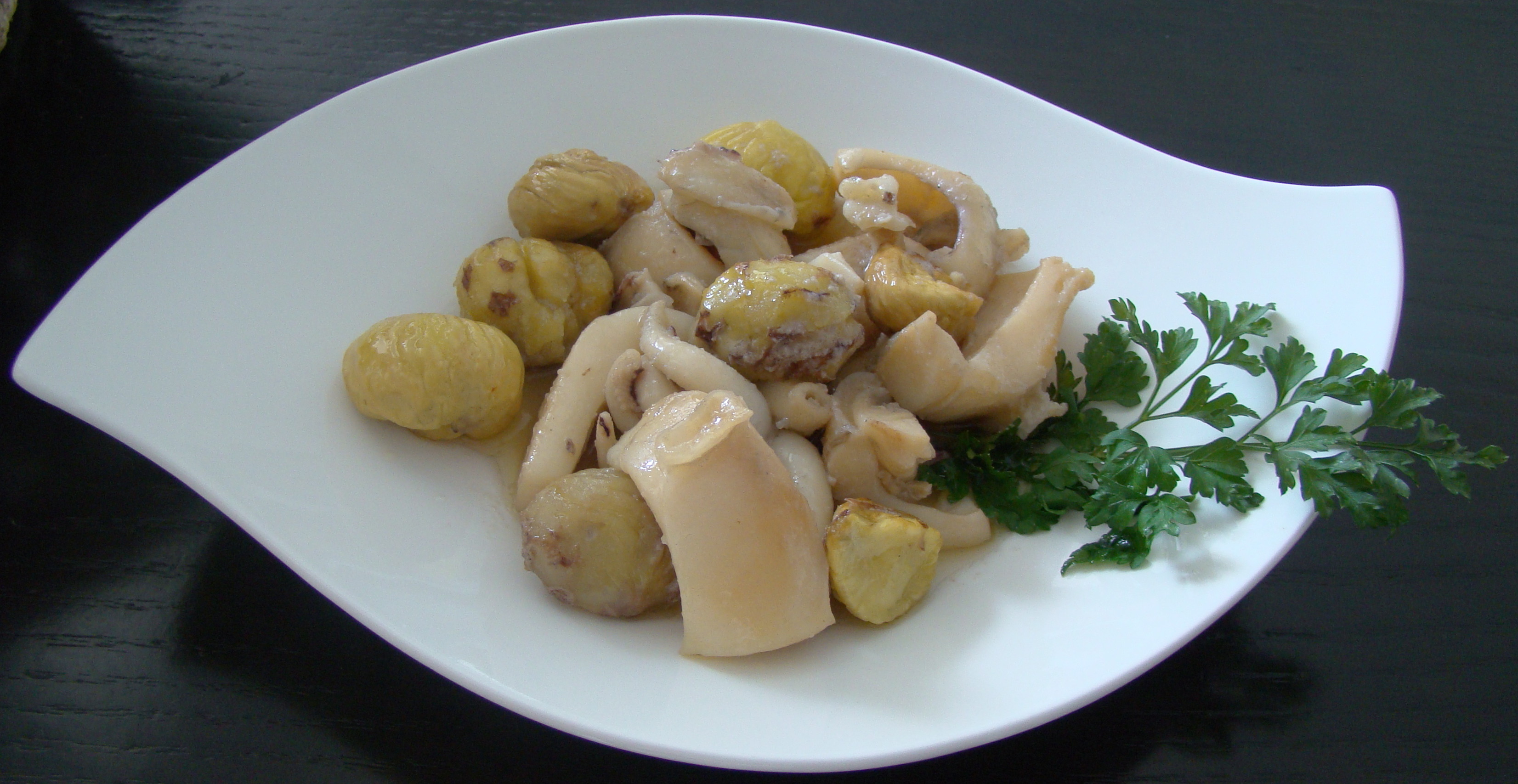 INGREDIENTES: 3 sepias enteras limpias, 2 cucharadas de aceite de oliva virgen, 2 cucharadas de brandy, 10 castañas y sal al gusto.