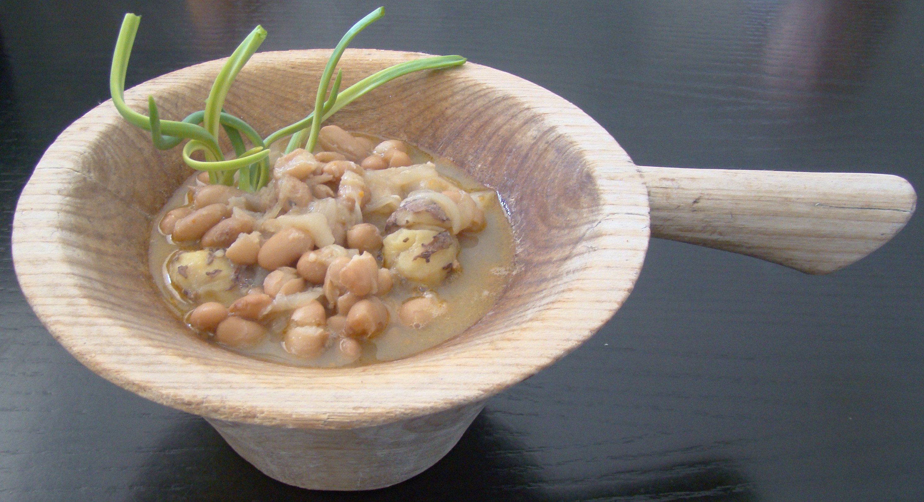 INGREDIENTES: 1 vaso de judías, 2 cebollas blancas, 2 cucharadas de aceite de oliva, 4 dientes de ajo, 1 chorizos de perro, 2 cucharadas de Brandy, 12 castañas y sal al gusto.