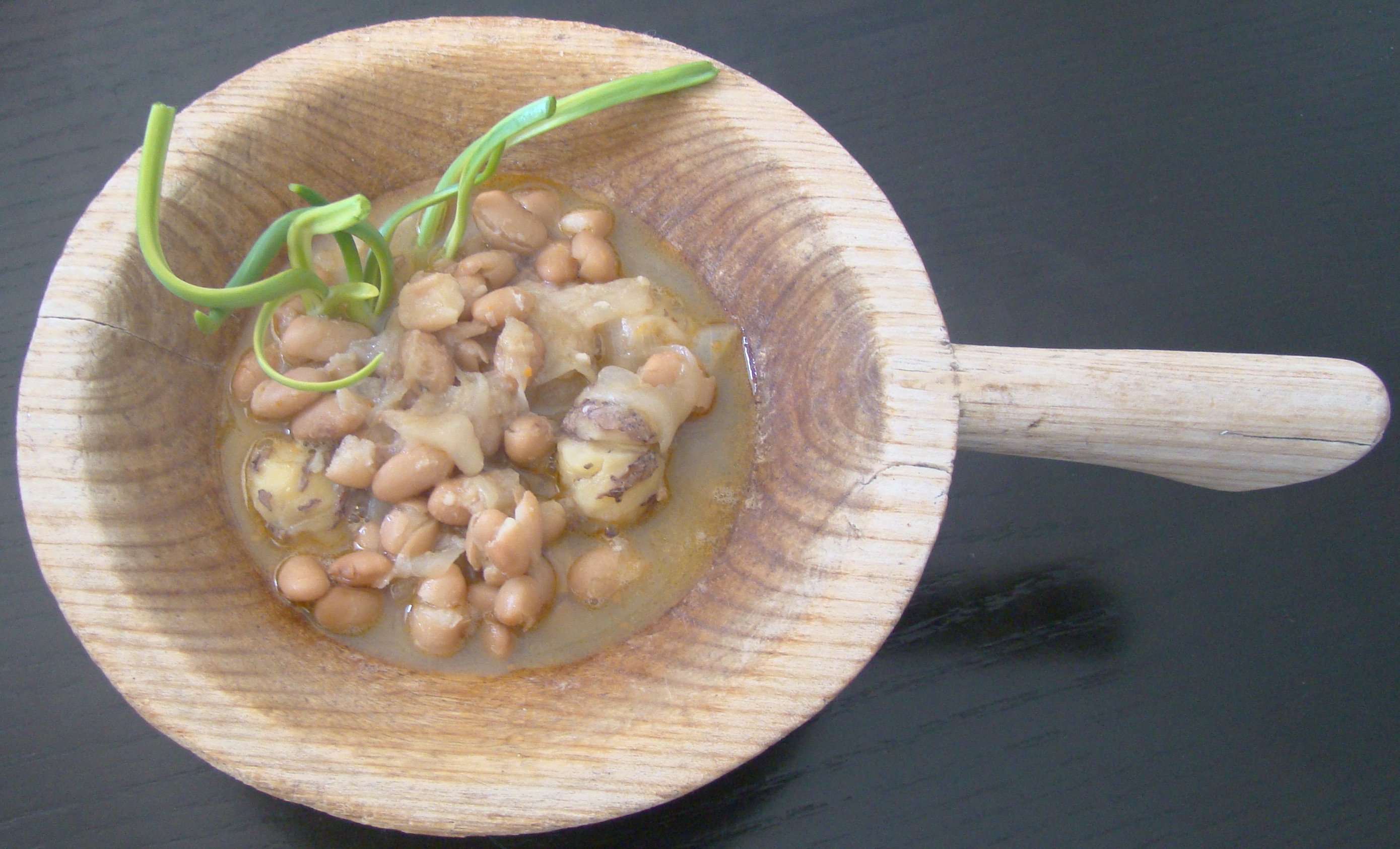 PREPARACIÓN: ponemos las judías la noche anterior de remojo; en una cazuela de barro ponemos las judías con agua que las sobrepase. Si es necesario añadir agua durante la cocción, lo hacemos con agua del tiempo. En este caso utilizamos fuego de gas porque usamos una olla de barro; cuando hierva bajamos el fuego. En una sartén hacemos el sofrito con las cebollas, los ajos y cuando estén dorados añadimos el Brandy, el chorizo y las castañas peladas; removemos y lo añadimos a las judías. Seguimos con la cocción hasta que estén hechas.