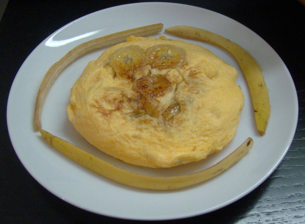 PREPARACIÓN: batimos los huevos y en una sartén pequeña con el aceite, ponemos el plátano cortado en rodajas y dejamos unos minutos, añadimos los huevos y cuando cuaje le damos la vuelta y a comer calentita.
