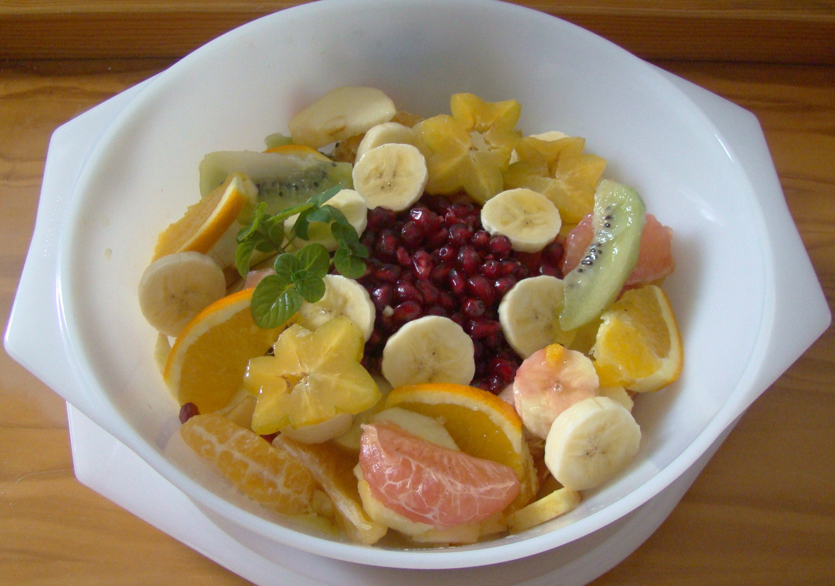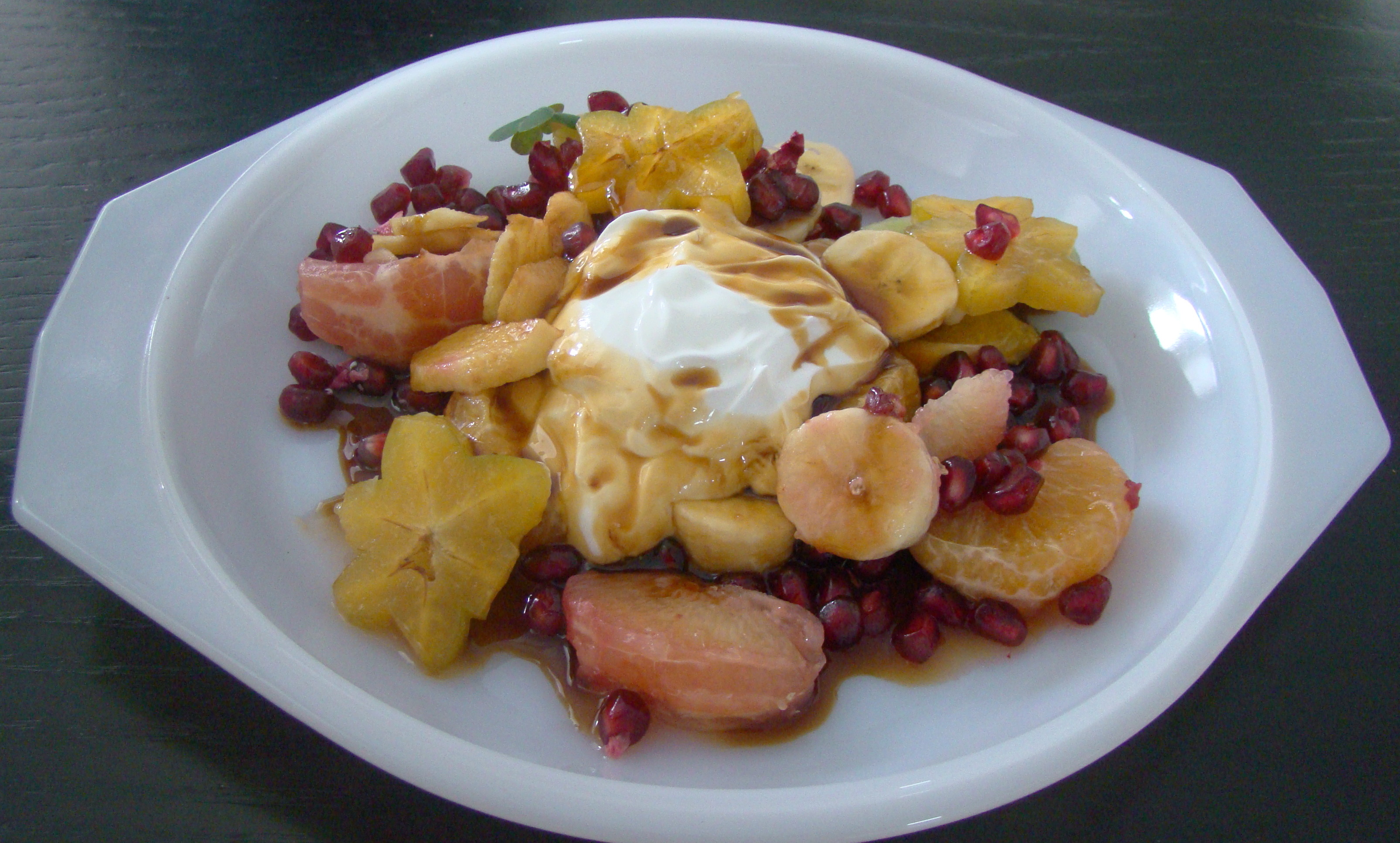 INGREDIENTES: 2 manzana reineta, 2 plátanos, 1 kiwi, 1 granada, 1 naranja, 1 pomelo, 1 carambola, el zumo de 1 limón. el zumo de 2 naranjas, 1 cucharada de miel de palma y 1 yogur griego natural sin azúcar.
