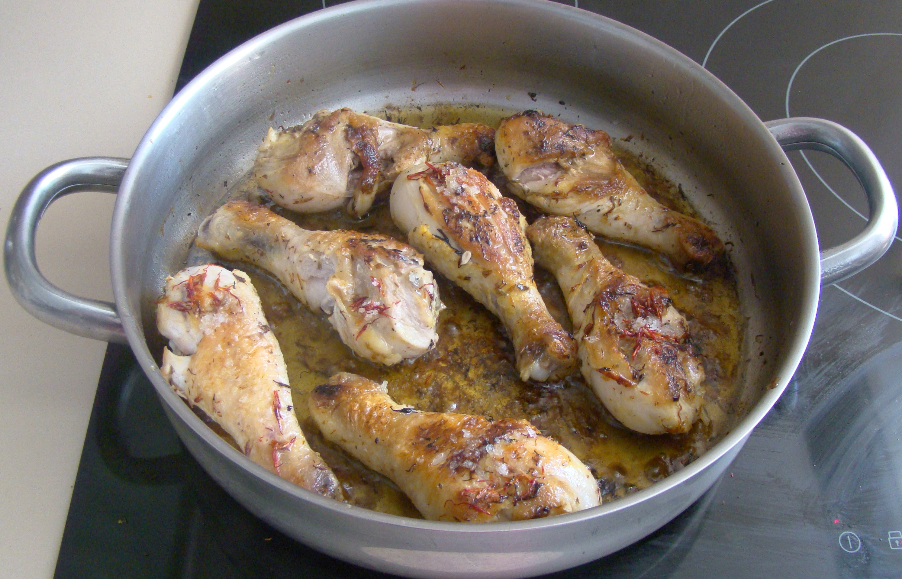 INGREDIENTES: 7 muslos de pollo, 2 cucharadas de aceite de oliva, 1 cucharadita de pimienta blanca, 1/2 cucharadita de comino, 1 cucharadita de sal y 1 cucharada de azafrán.