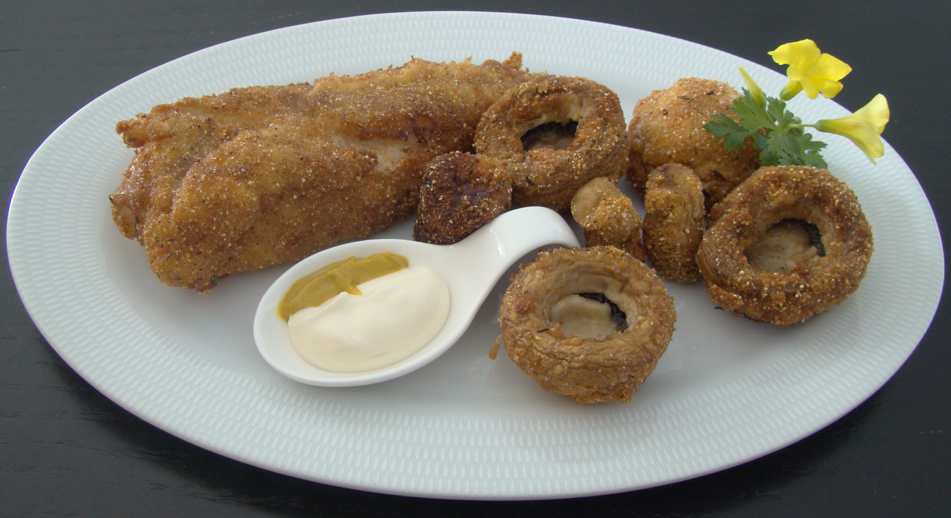 INGREDIENTES: 1cola de rape, 6 champiñones, 1 huevo, 4 cucharadas de pan rallado, 1 pizca de pimienta blanca, 1 cucharadita de orégano, 1 de tomillo, 1 de sal, aceite de oliva suave para freir, 3 cucharadas de mayonesa y 1 de mostaza.