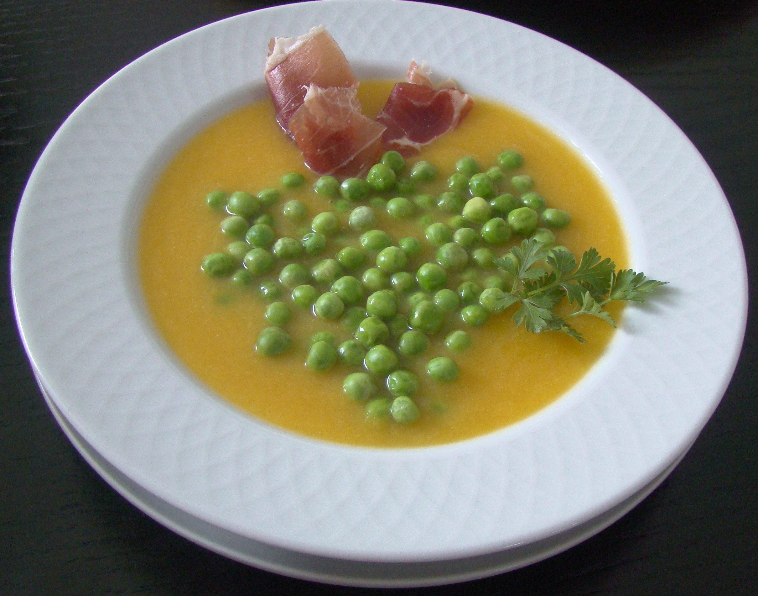 PREPARACIÓN: ponemos en un caldero adecuado, el aceite, los ajos enteros, la calabaza troceada y las papas, damos 2 minutos de fuego y agregamos 2 vasos de agua, seguimos la cocción, añadimos la sal y mantenemos a fuego medio unos 20 minutos. Apartamos, trituramos y al momento de servir ponemos el jamón y los guisantes.