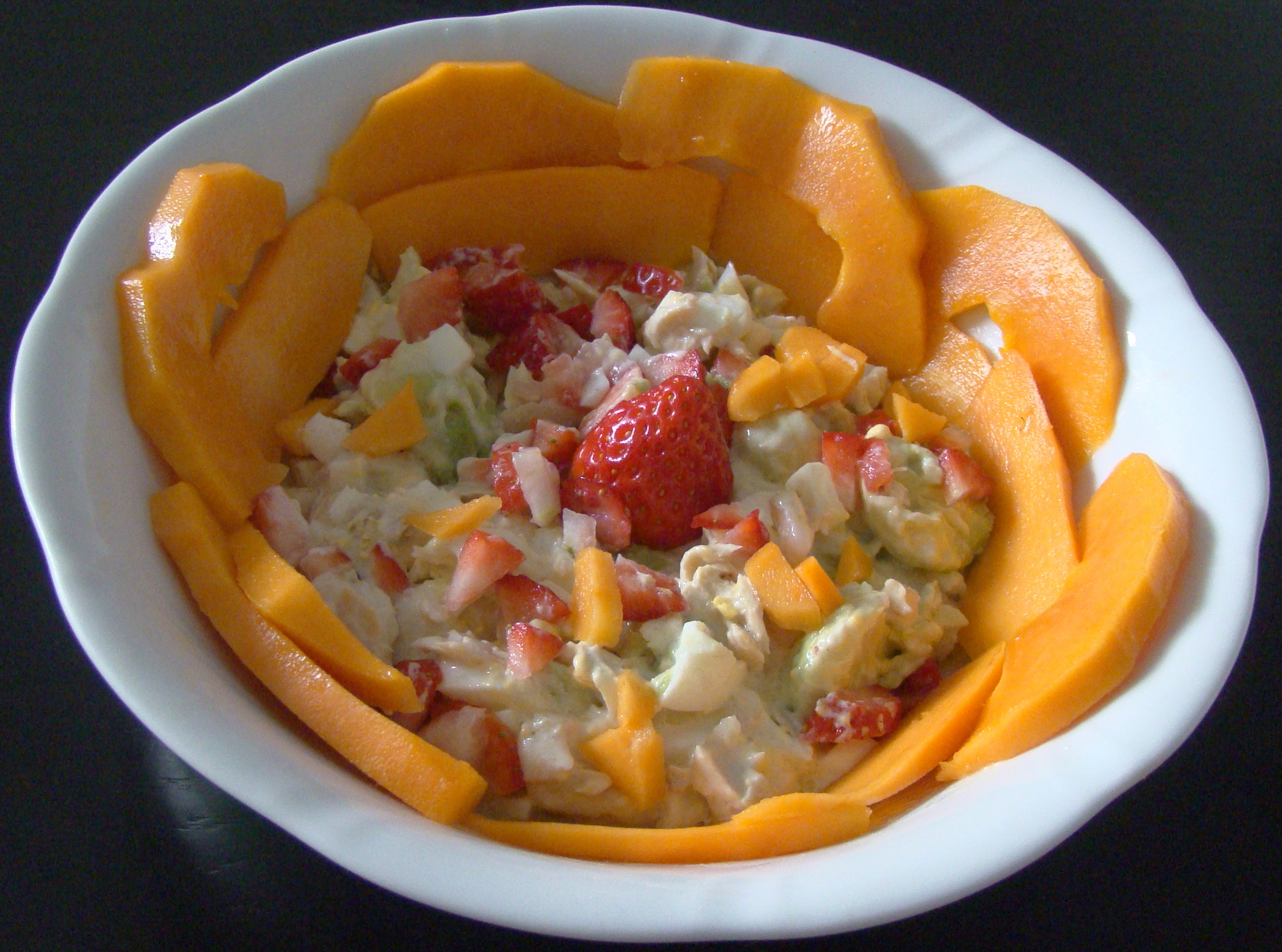 INGREDIENTES: 2 aguacates, 70 gramos de bonito, 2 huevos duros, 1 trozo de papaya, 8 fresas y mayonesa.