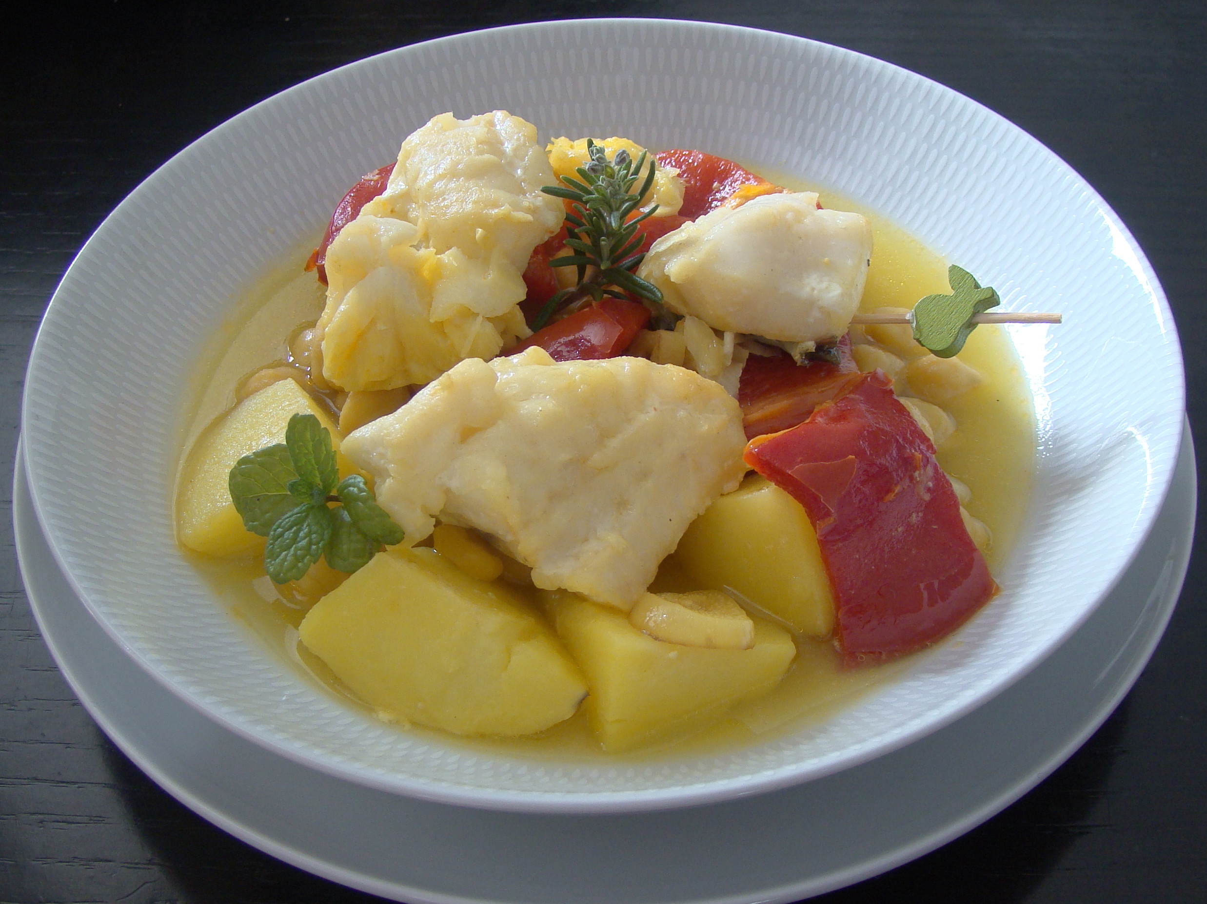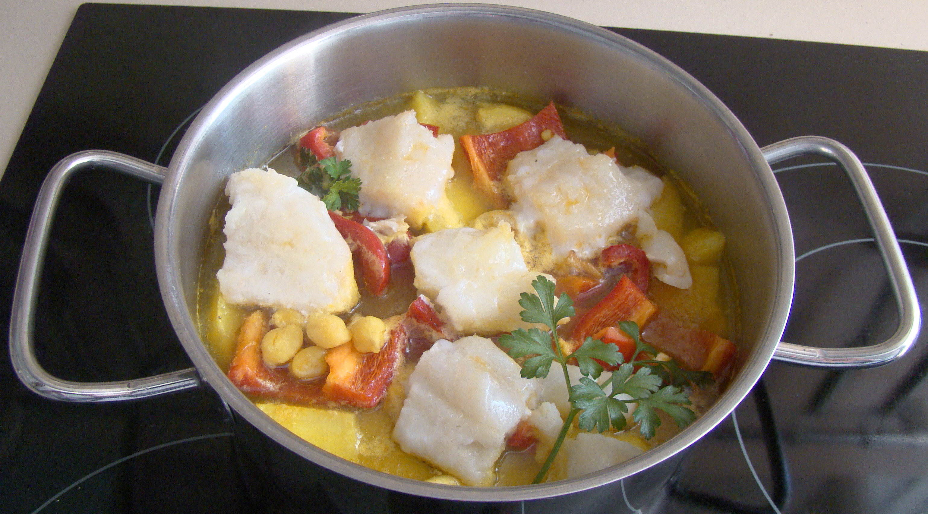 INGREDIENTES: 1 vaso de garbanzos, 3 dientes de ajo enteros,1 cucharada de aceite de oliva, 2 lomos de bacalao, 4 papas, 1 pimiento encarnado, 1 pizca de comino molido, 1 pizca de cúrcuma, 2 vasos de agua y sal al gusto.