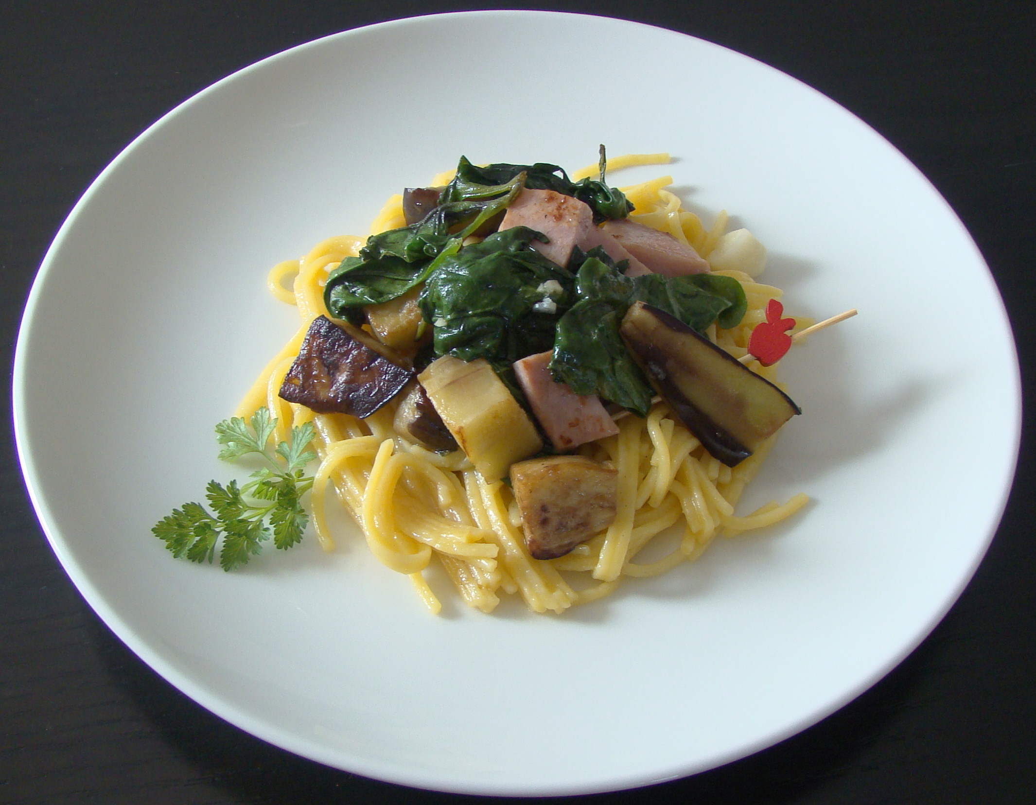 INGREDIENTES: 1 berenjena, 200 gramos de jamón, 100 gramos de espinacas, 1 ajo, 1 cucharada de aceite de oliva, espaguetis sin gluten y sal al gusto.
