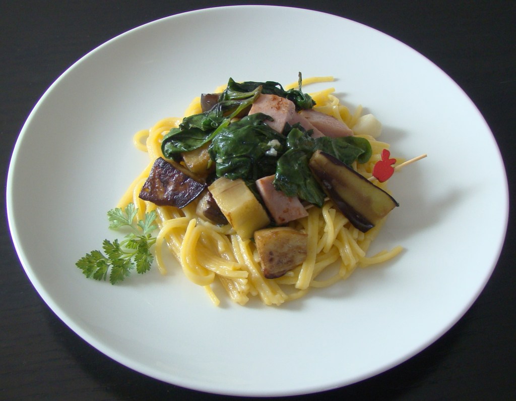PREPARACIÓN: pelamos la berenjena y cortamos en trocitos, asamos y reservamos. En la misma sartén añadimos los ajos picaditos y las espinacas unos minutos, sacamos y reservamos. Añadimos si es necesario un poquito de aceite y asamos el jamón cortado en tacos. Mezclamos todo y en está ocasión lo hemos acompañado con espaguetis sin gluten.