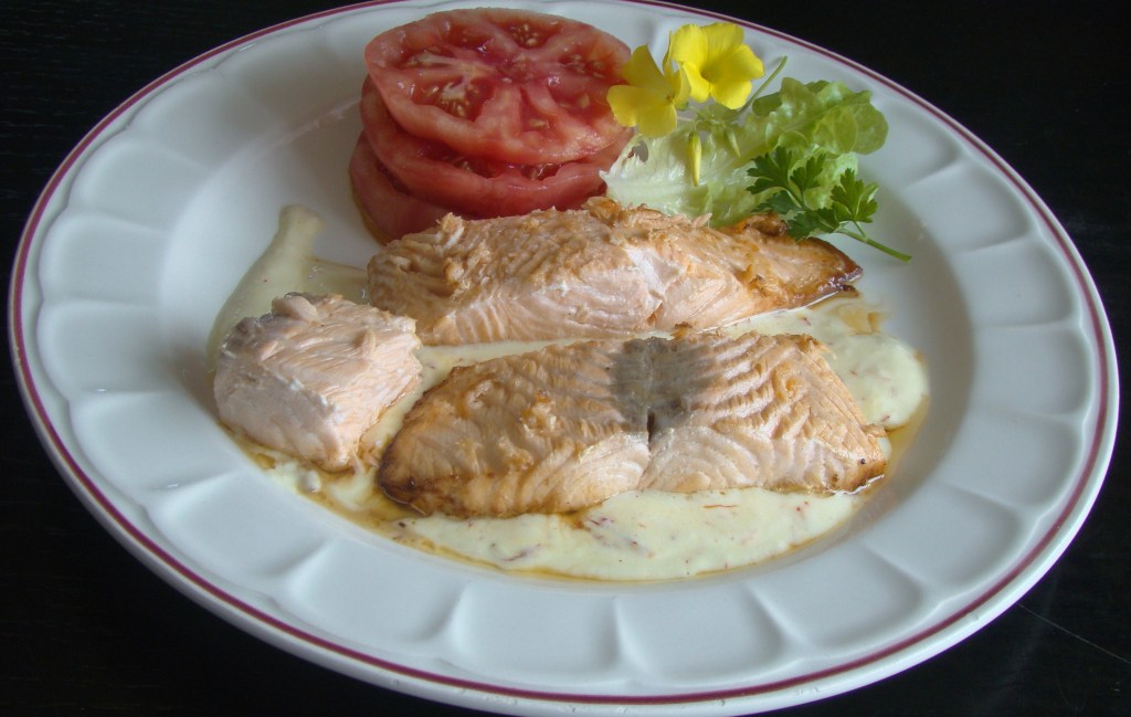 PREPARACIÓN: para la salsa: en un mortero machacamos los ajos, añadimos la pimienta blanca, el azafrán, terminamos de machacar y reservamos. En un cuenco ponemos los yogures y batimos a mano, le añadimos 1 cucharadita de aceite de oliva virgen, 1 cucharadita de sumo de limón, la mezcla del mortero, mezclamos todo con suavidad y reservamos en la nevera. Ponemos en una sartén el aceite y cuando esté caliente añadimos el salmón y asamos 1 minuto por cada lado. Apartamos y servimos con la salsa y el tomate.