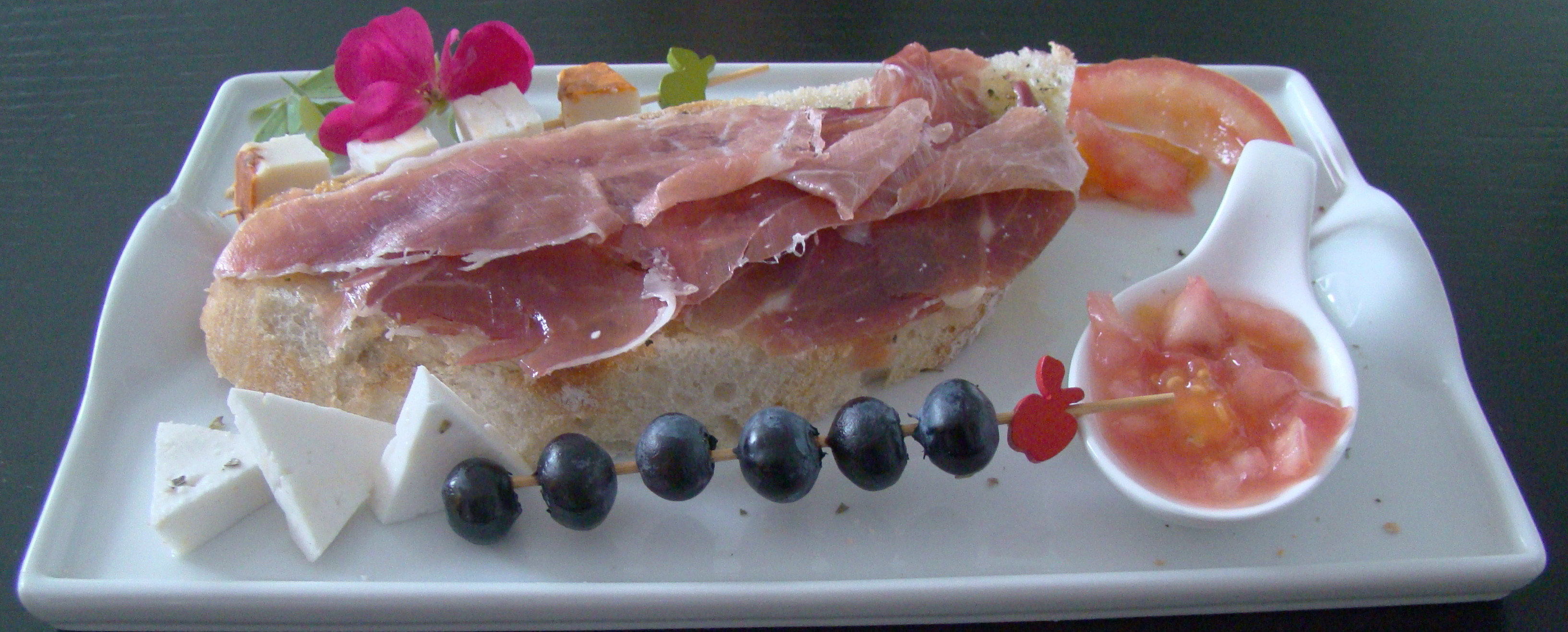 PREPARACIÓN: untamos el pan con aceite, le añadimos orégano, el tomate y el jamón. Emplatamos añadiendo 1 mini brocheta de arándanos y otra con los quesos.