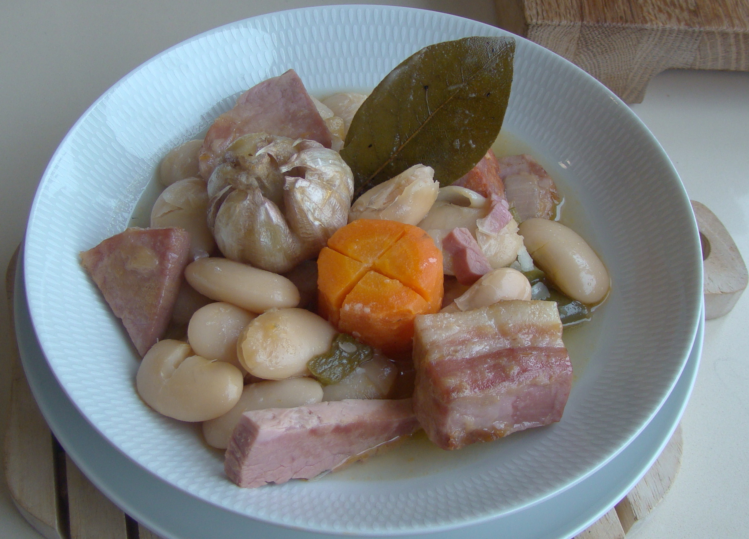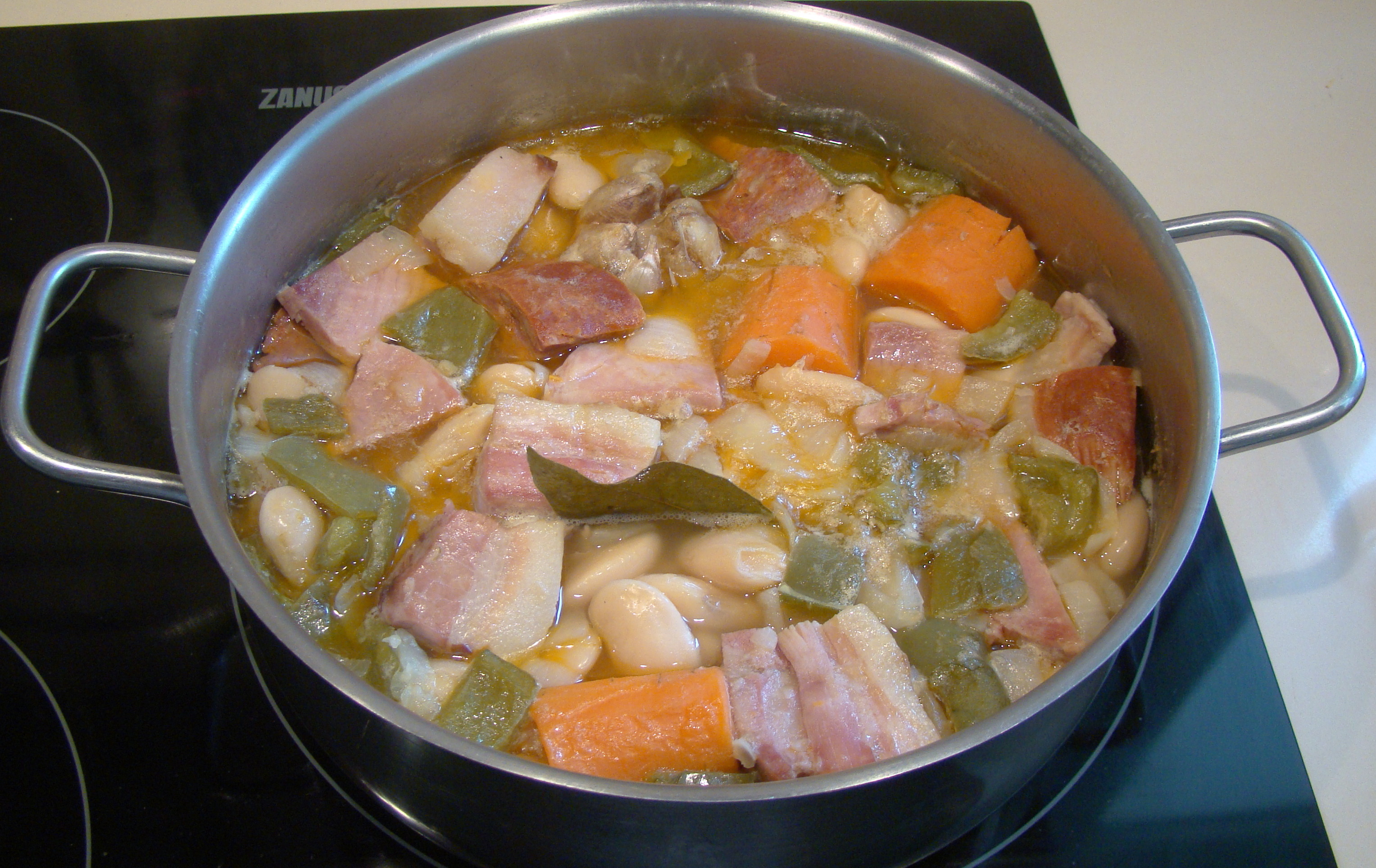 INGREDIENTES: 1/2 kilo de judías blancas, 150 gramos de jamón york en loncha gruesa, 150 gramos de chorizo, 150 gramos de panceta, 1 cebolla, 1 zanahoria, 2 cucharadas de Brandy, 2 cucharadas de aceite de oliva, 1 pimiento verde, 1 cabeza de ajo, 1 hoja de laurel y sal a gusto.