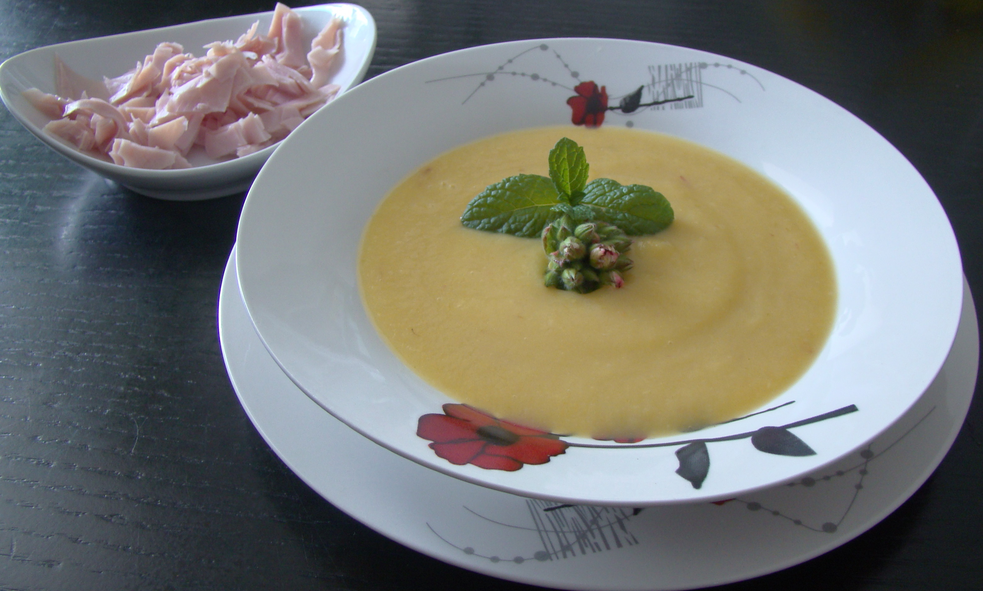 PREPARACIÓN: en un caldero ponemos el aceite, los ajos, la cebolla cortada en trozos y doramos; añadimos el resto de verduras cortadas en trozos, agregamos 2 vasos de agua y seguimos la cocción aproximadamente durante 30 minutos, apartamos, añadimos la cúrcuma, trituramos y el jamón troceado así como la hortelana y el geranio (ambos son comestibles) lo añadimos en el momento de servir