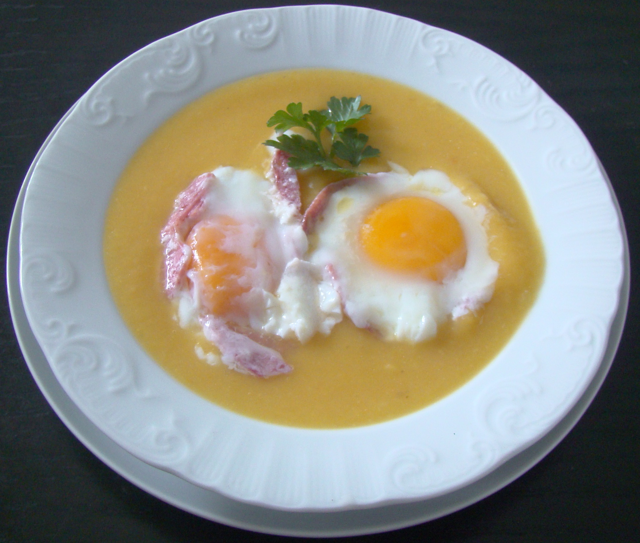 PREPARACIÓN: Ponemos en un caldero, el aceite, los ajos enteros, el calabacín, la zanahoria y las papas troceados. Ponemos al fuego 2 minutos y añadimos agua que los cubra. Guisamos durante 20 minutos, apartamos y trituramos. Cortamos el salchichón en trocitos. Escalfamos los huevos (ponemos papel film en un cuenco pequeño, añadimos trocitos del salchichón, el huevo y cerramos con un nudo) y los cocemos en agua que los cubra durante 2 minutos. Emplatamos y servimos.