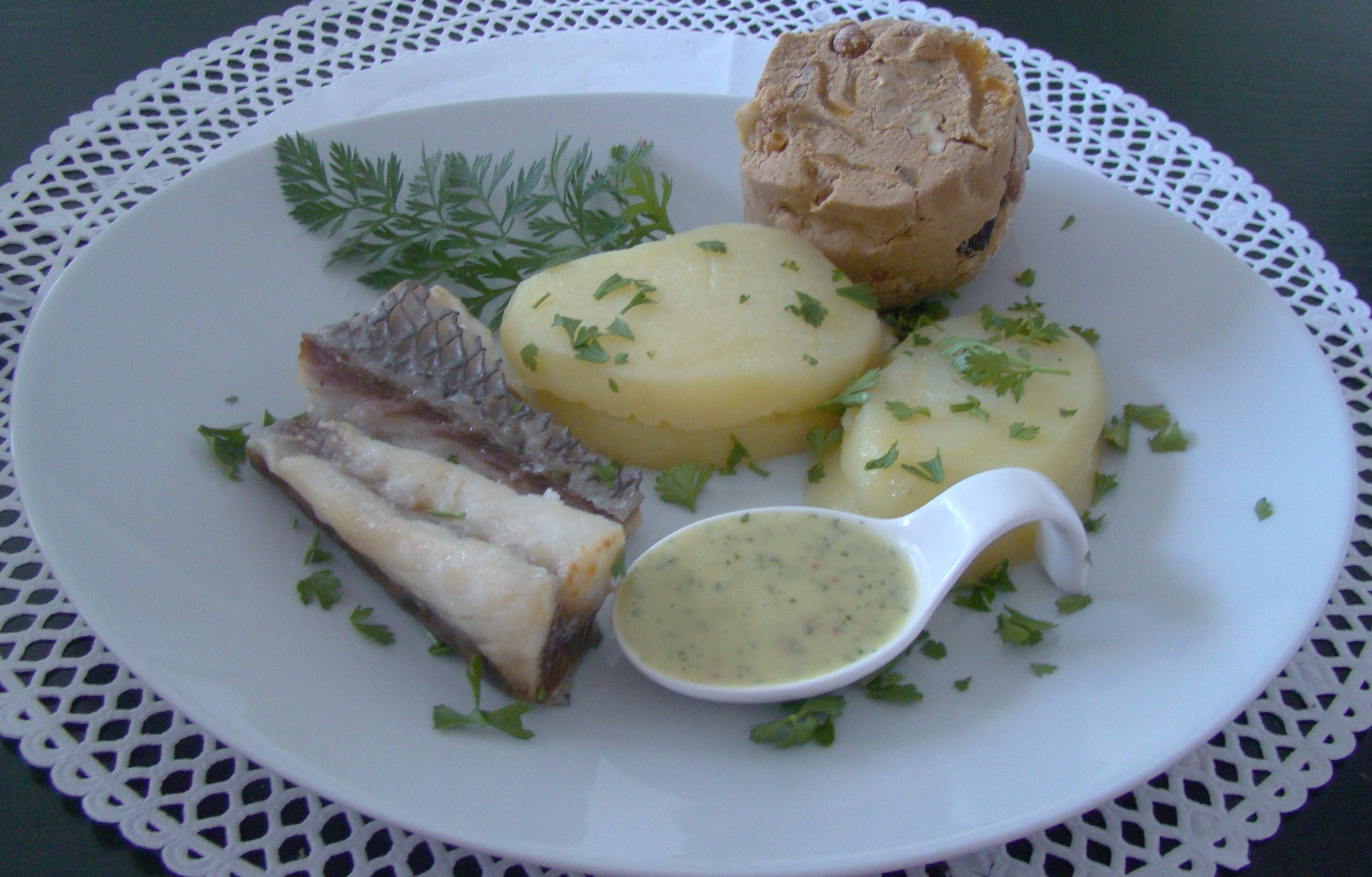 INGREDIENTES: 1 trozo de pescado salado, 2 papas, un manojo pequeño de perejil, 2 hojas de zanahorias, 4 ajos, 1 trocito pequeño de pimienta picona, 2 cucharadas de agua, 3 cucharadas de aceite de oliva virgen y 1 cucharadita de sal.