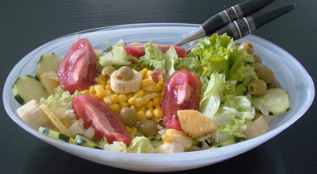 INGREDIENTES: 2 plátanos, 1 pepino pequeño, 2 tomates pera,1 manzana, 1 lata pequeña de millo, 1 lata pequeña de aceitunas rellenas de anchoa, cogollos de lechuga aceite de oliva virgen y vinagre de manzana para el aliño.