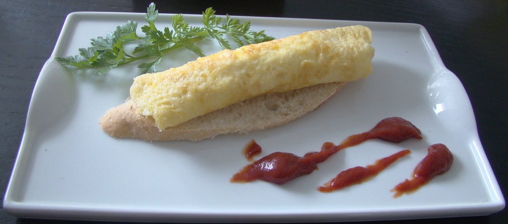 PREPARACIÓN: batimos el huevo, le añadimos la mantequilla, batimos un poco más y ponemos en una sartén pequeña con el aceite ya caliente. Vigilamos que esté cuajada y damos la vuelta. Sacamos, ponemos en una tabla de cocina y hacemos el rollito.