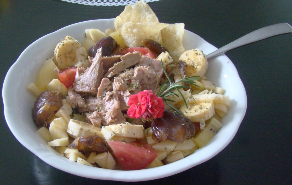 PREPARACIÓN: pelamos la manzana y cortamos en trocitos pequeños, pelamos el plátano y cortamos en rodajas, pelamos el kiwi y cortamos en trocitos, quitamos la semilla a los dátiles y ponemos enteros, el tomate troceado, añadimos el atún con su aceite y al momento de servir añadimos el vinagre.