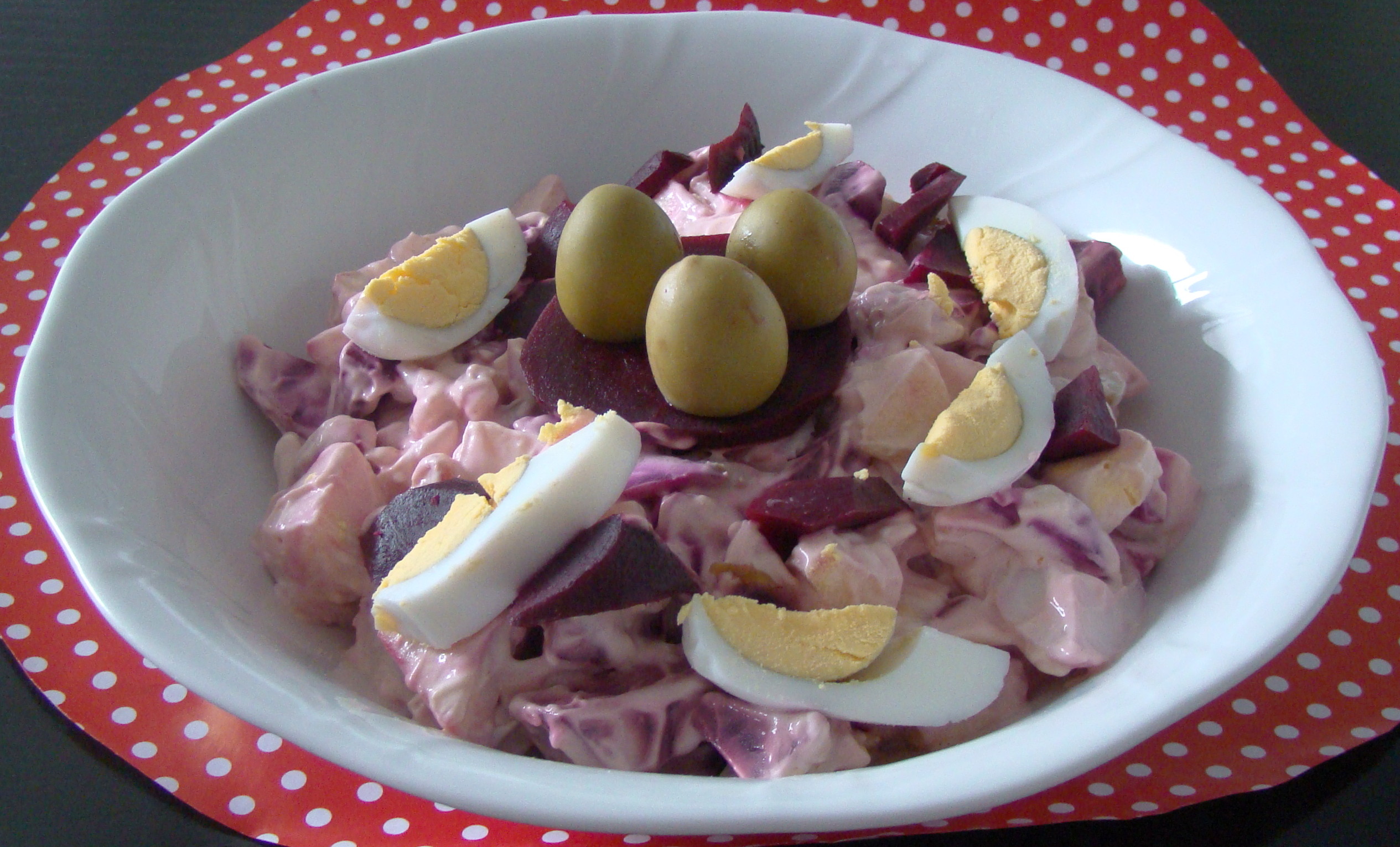 PREPARACIÓN: guisamos durante 12 minutos la beterrada, escurrimos y cortamos en trocitos; hacemos lo mismo con la manzana, la cebolla, la piña y vamos poniendo en una bandeja honda. Añadimos la mayonesa y finalmente emplatamos colocando las aceitunas y los huevos.